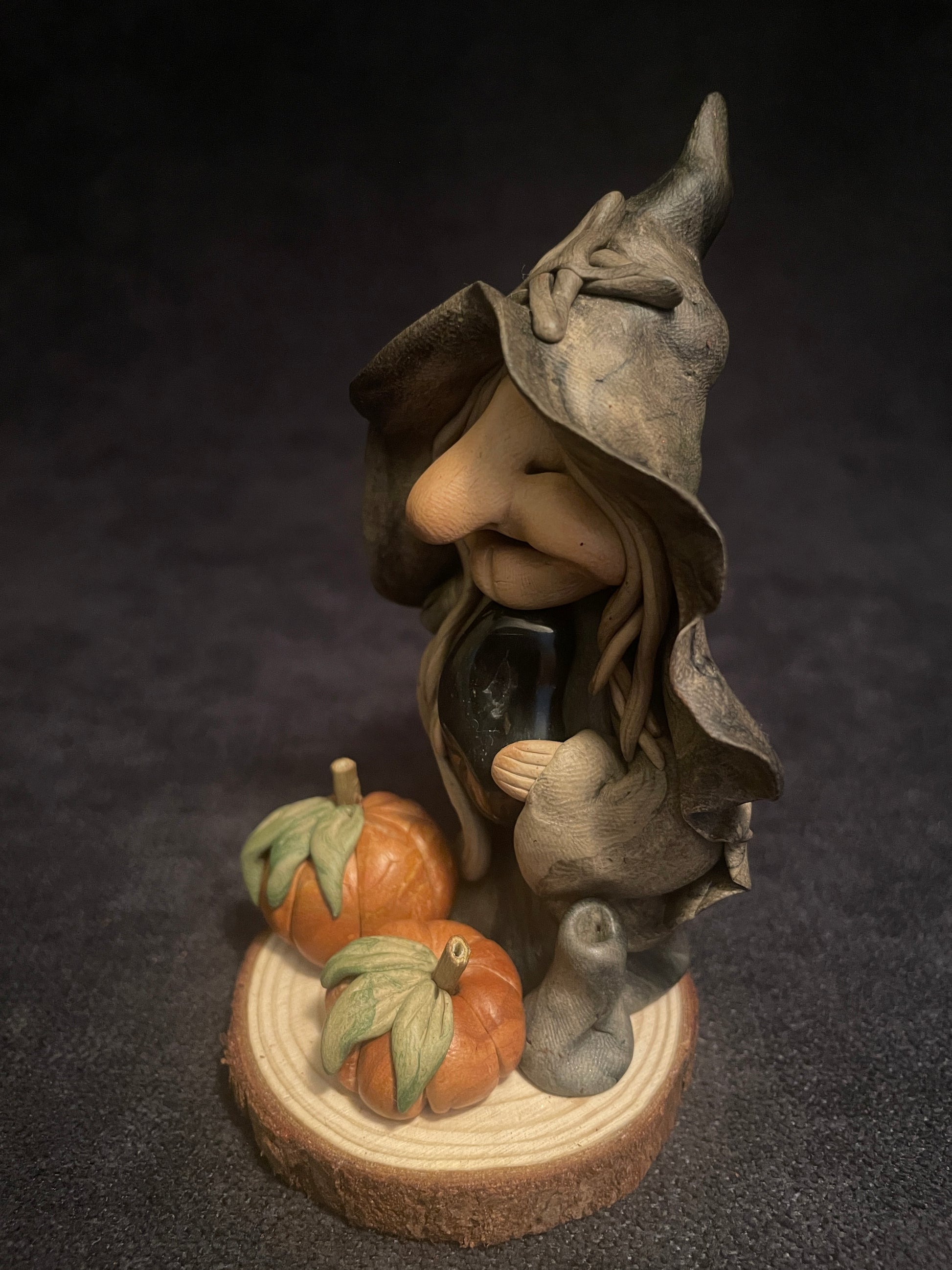 Je modèle ces sorcières en pâte autodurcissante. Chaque figurine est une pièce unique qui se distingue par son caractère, ses éléments naturels et sa singularité.