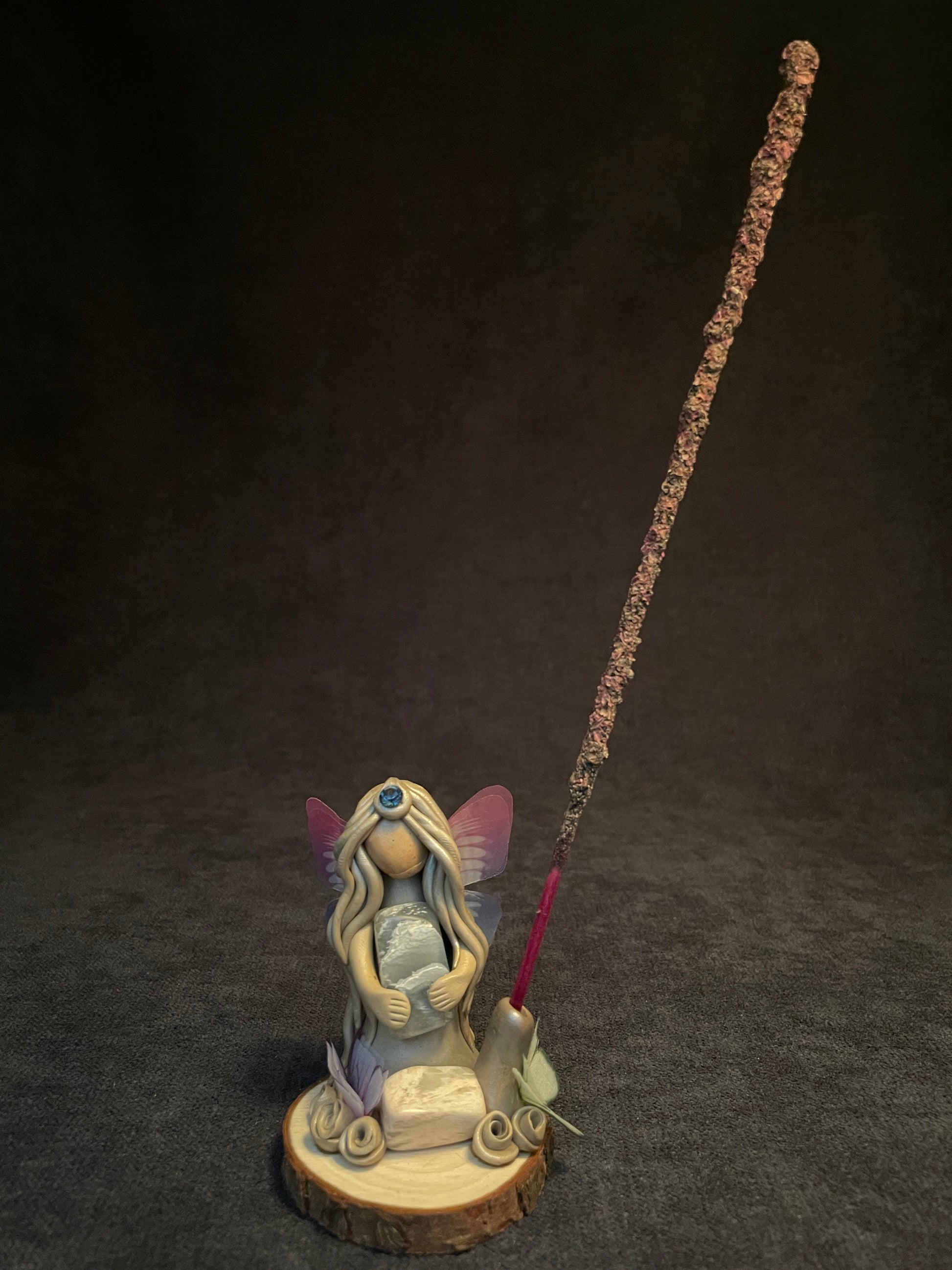 Cette figurine se compose de deux pierres naturelles de pierre de lune. Ses ailes sont en tissu et son socle est en bois. C'est aussi un porte-encens.