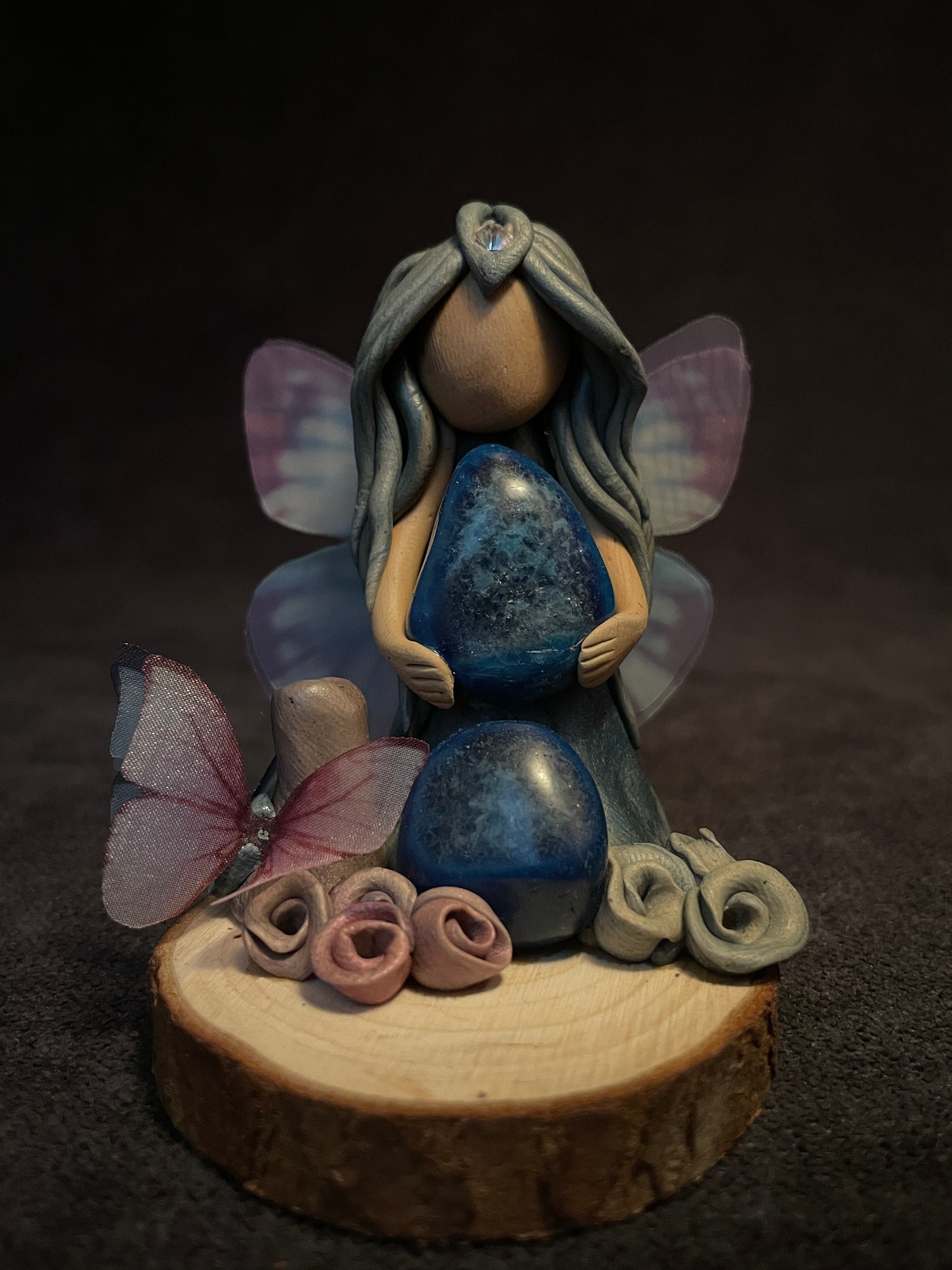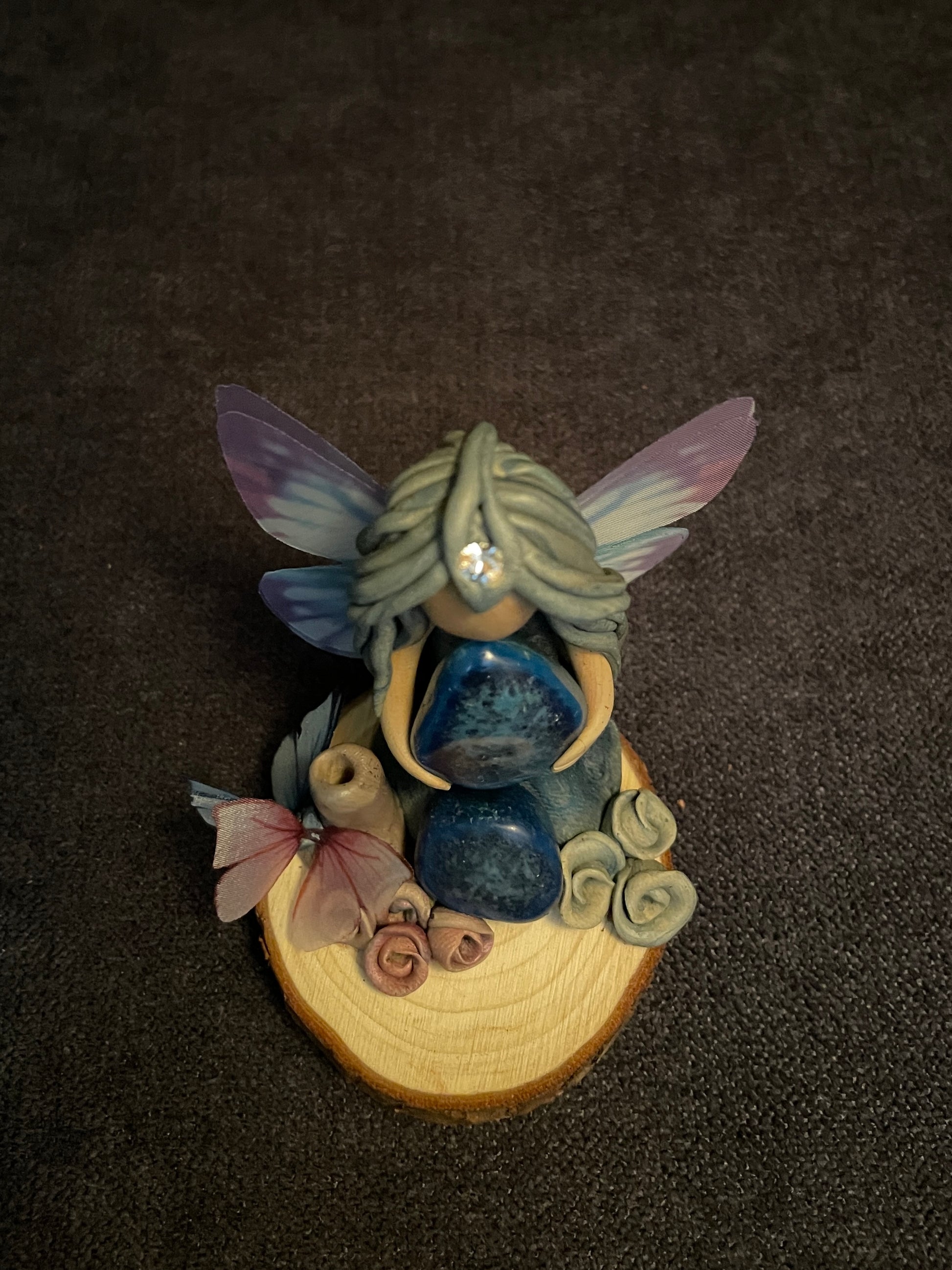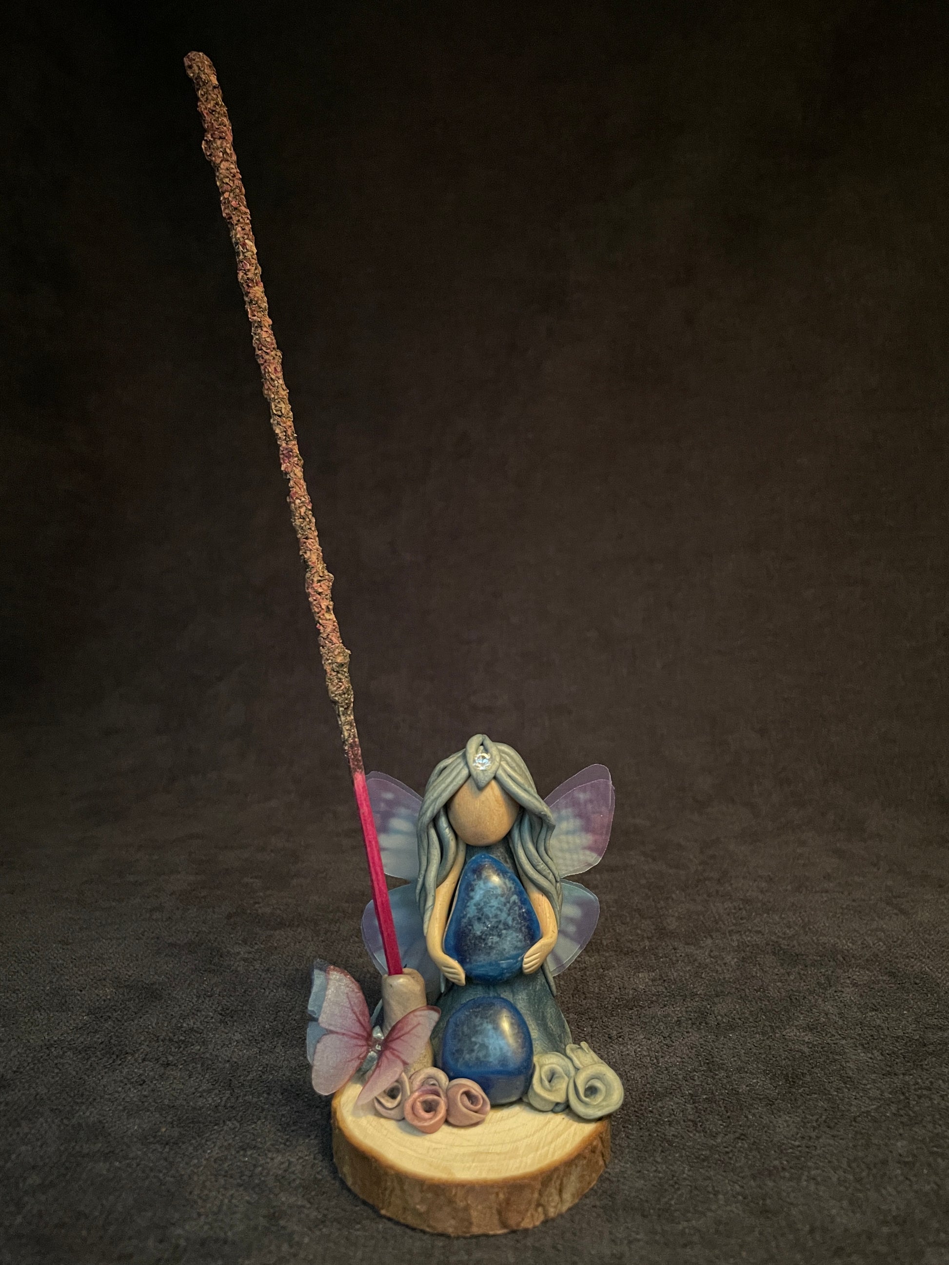 Cette figurine se compose de deux pierres naturelles d’agate bleue. Ses ailes sont en tissu et son socle est en bois. C'est aussi un porte-encens.