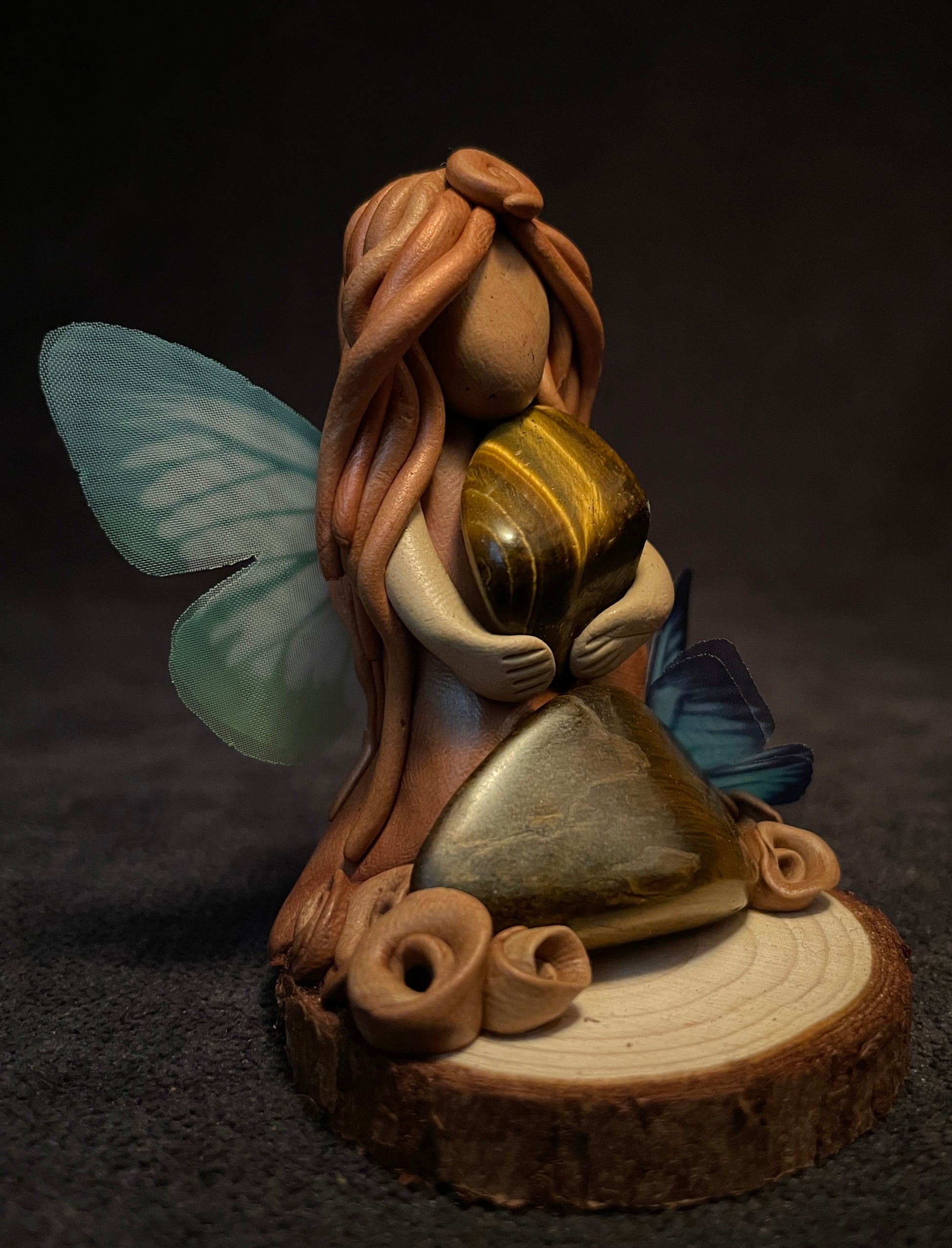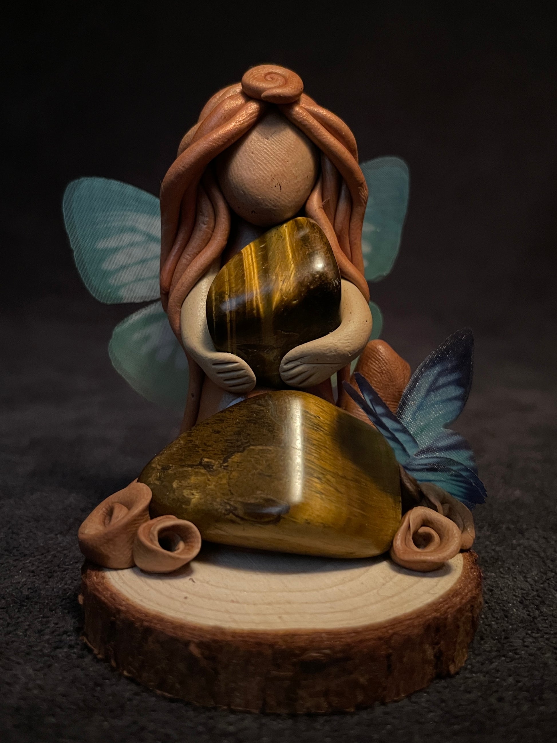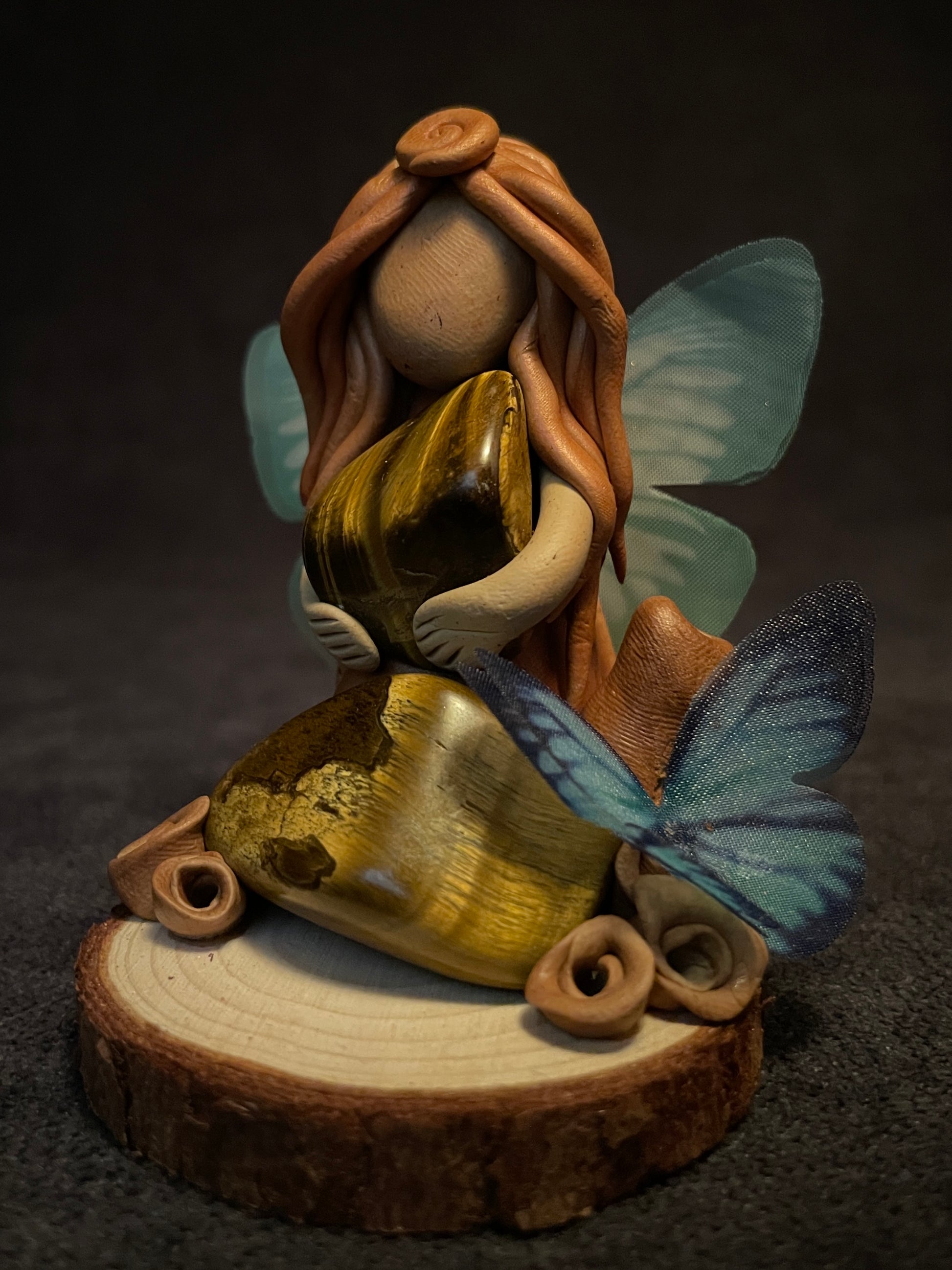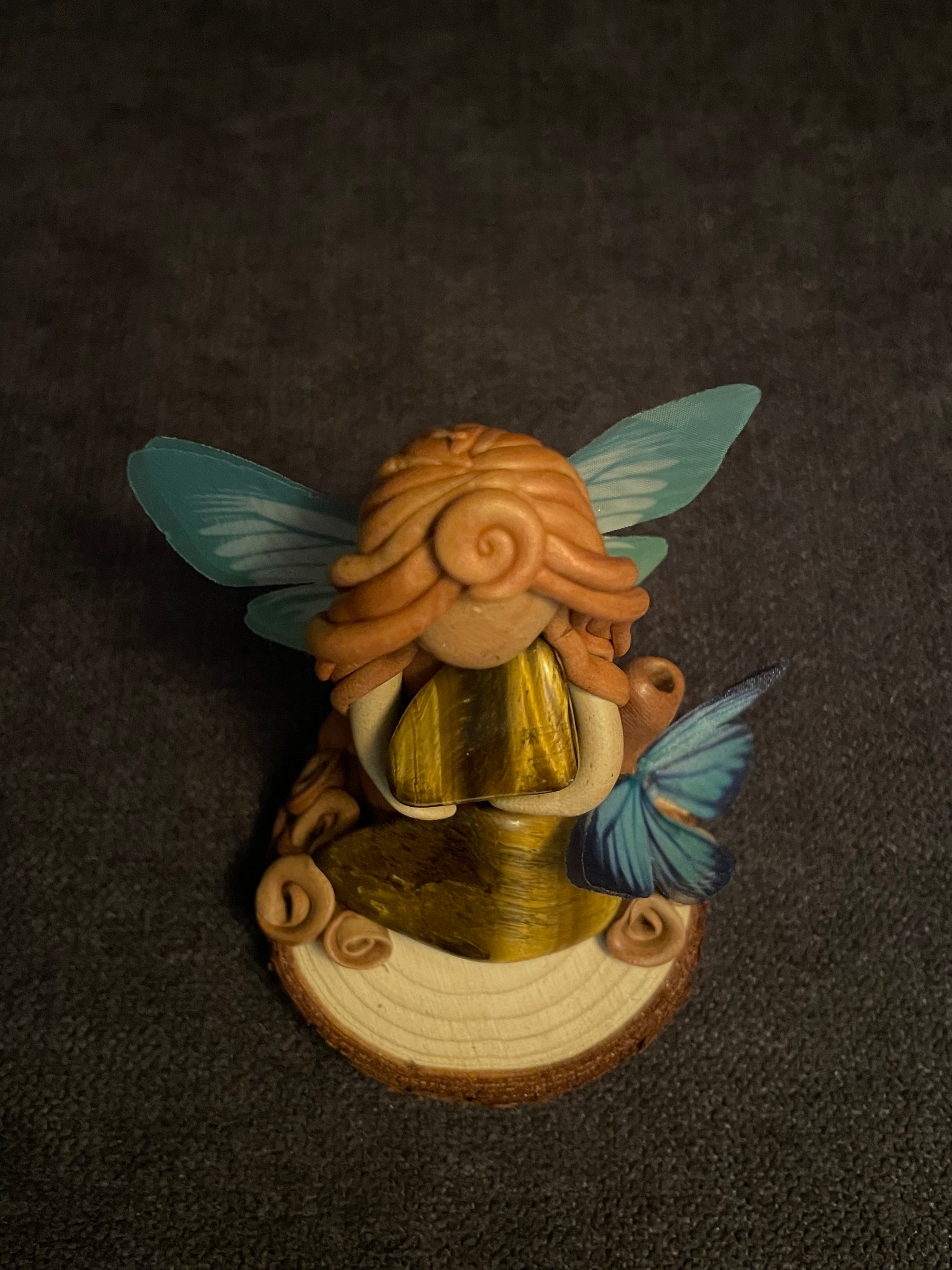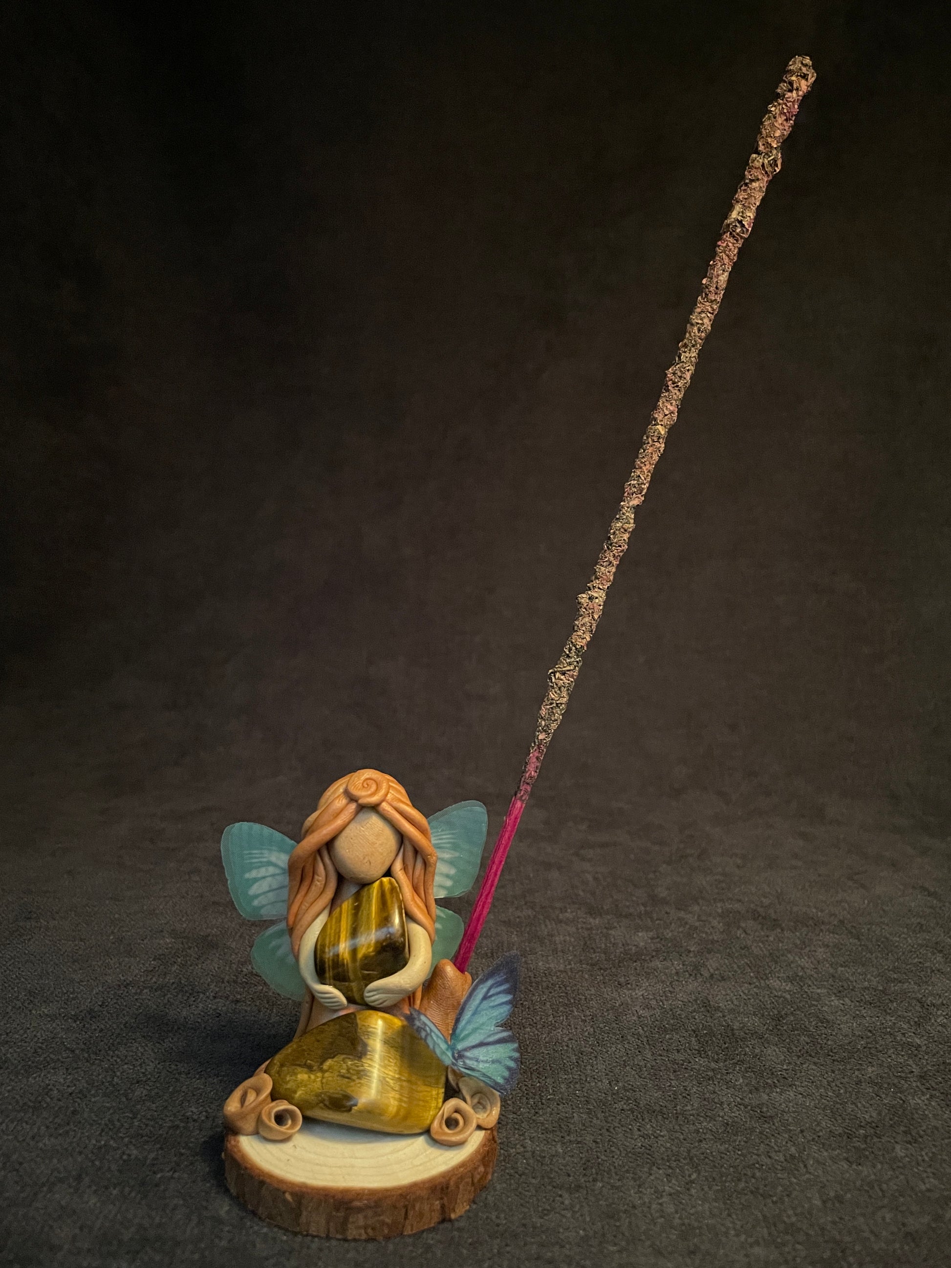Cette figurine se compose de deux pierres naturelles d’œil de tigre. Ses ailes sont en tissu et son socle est en bois. C'est aussi un porte-encens.
