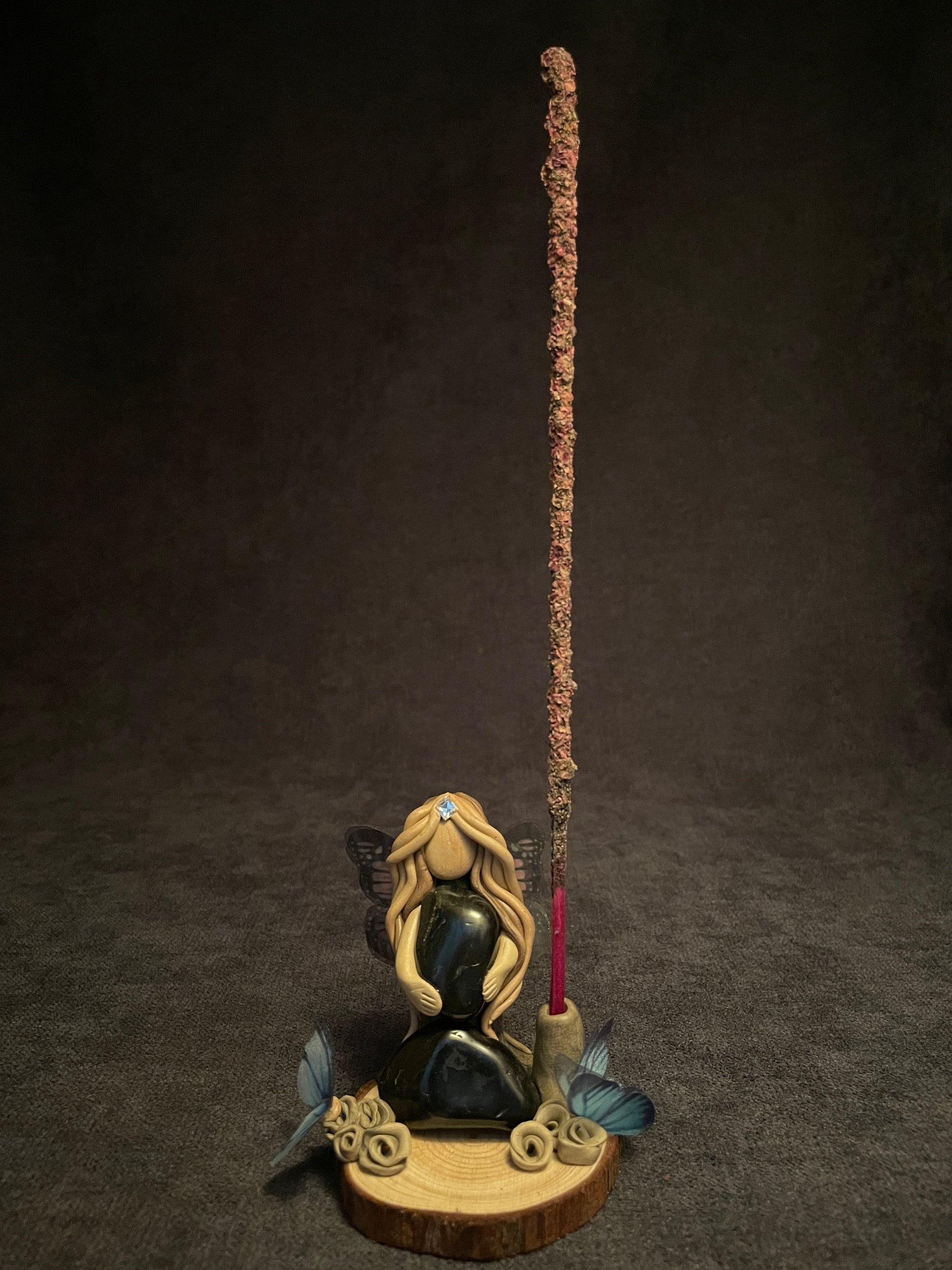 Cette figurine se compose de deux pierres naturelles d’onix noir. Ses ailes sont en tissu et son socle est en bois. C'est aussi un porte-encens.