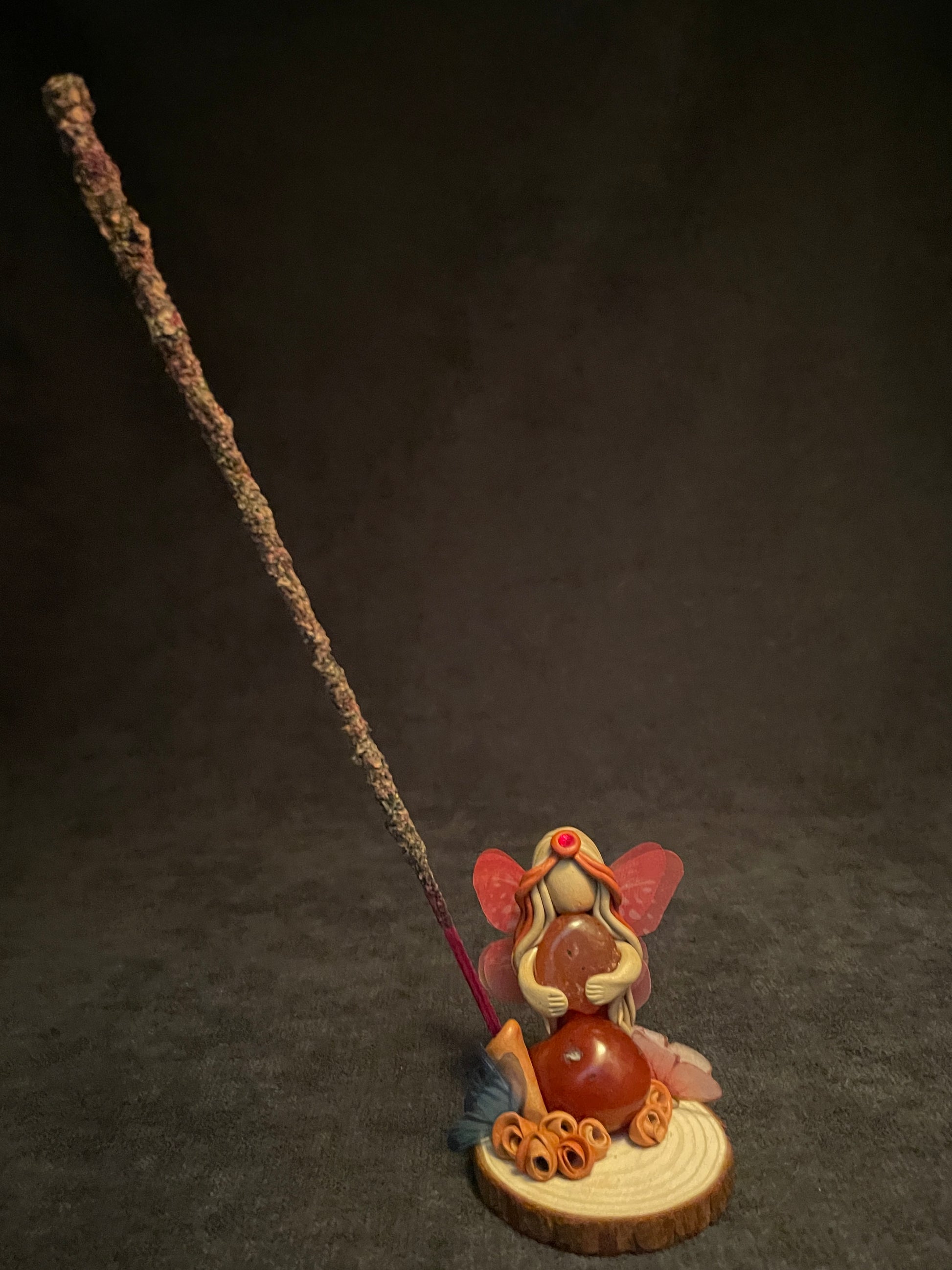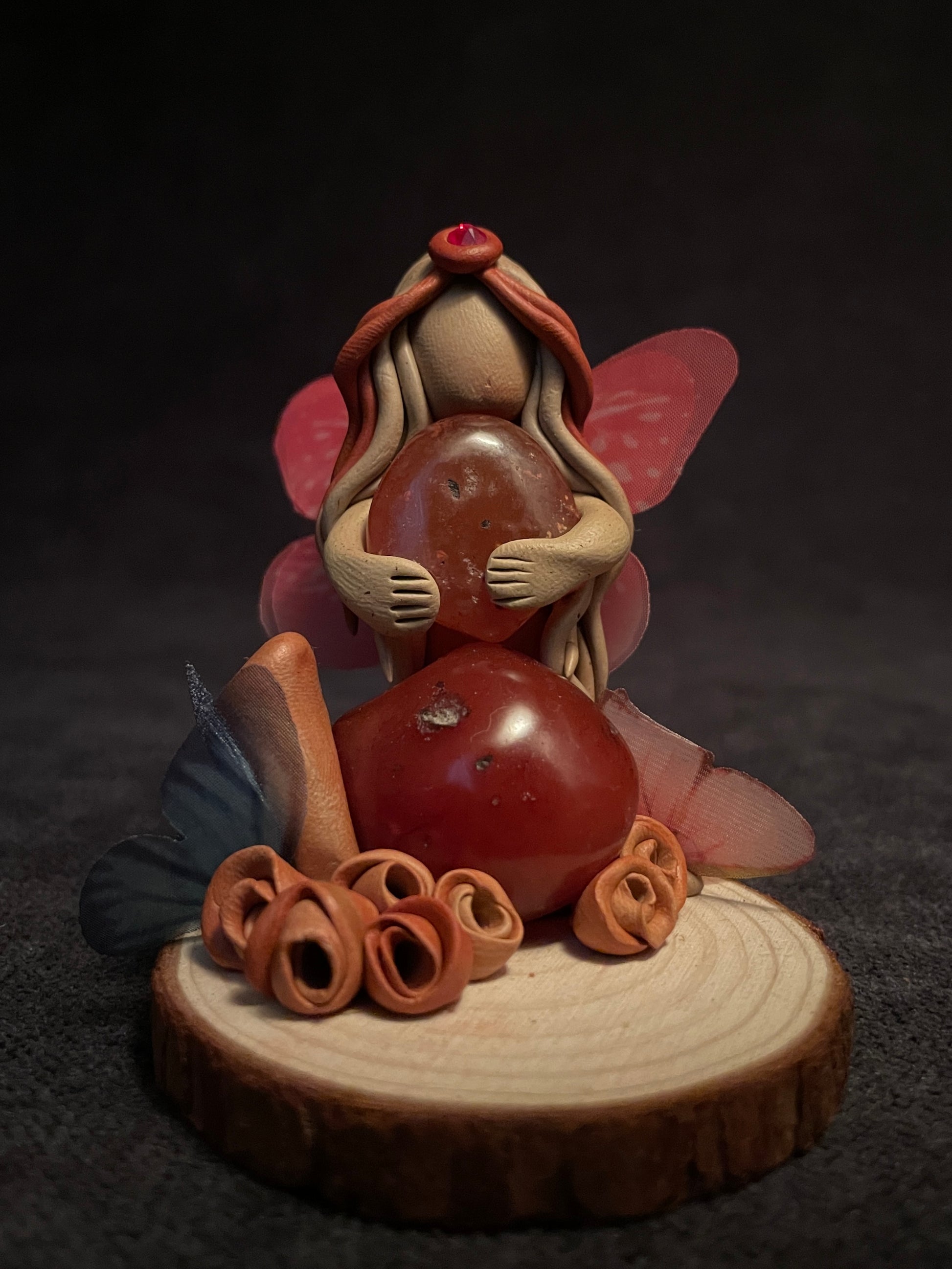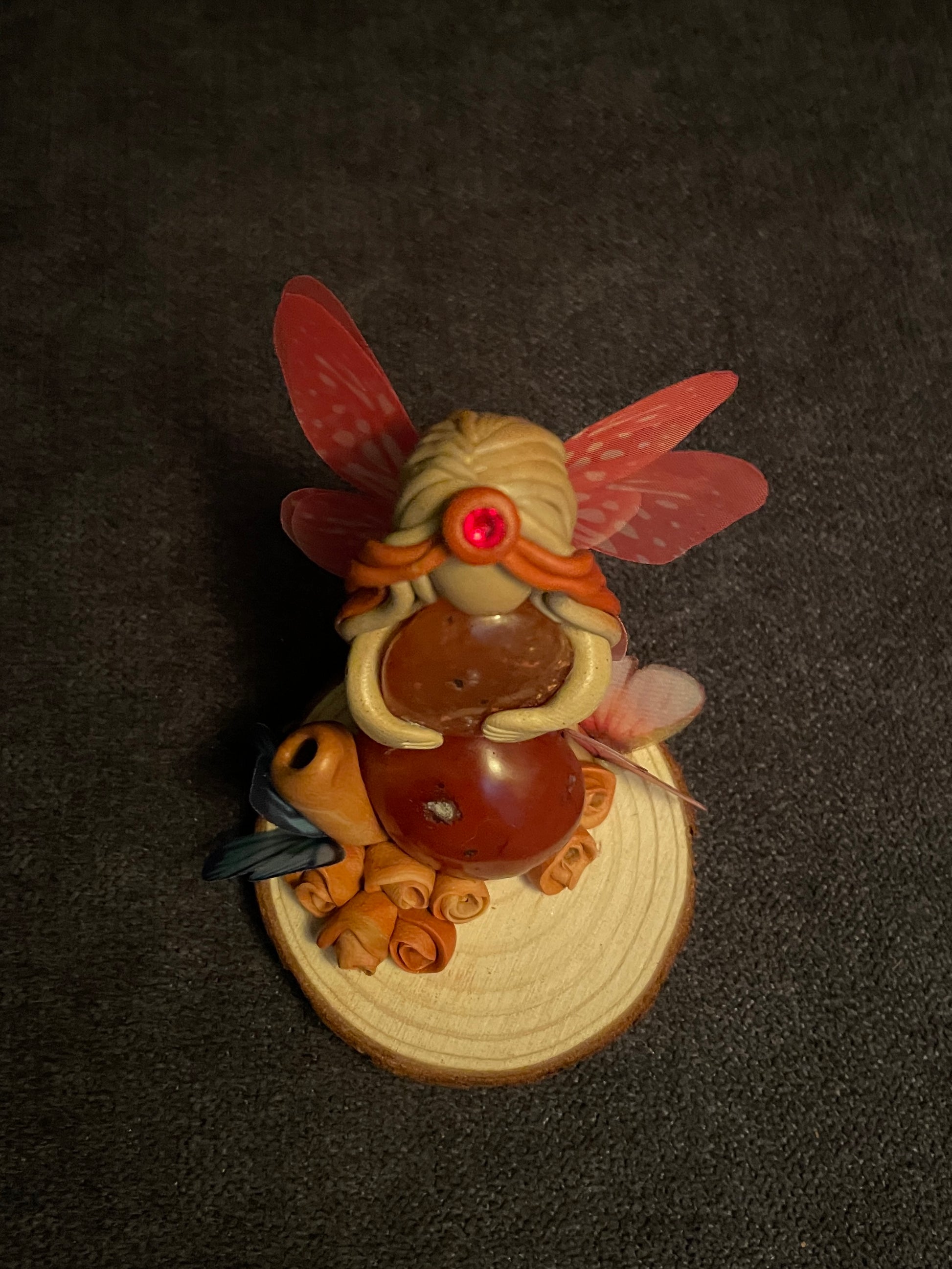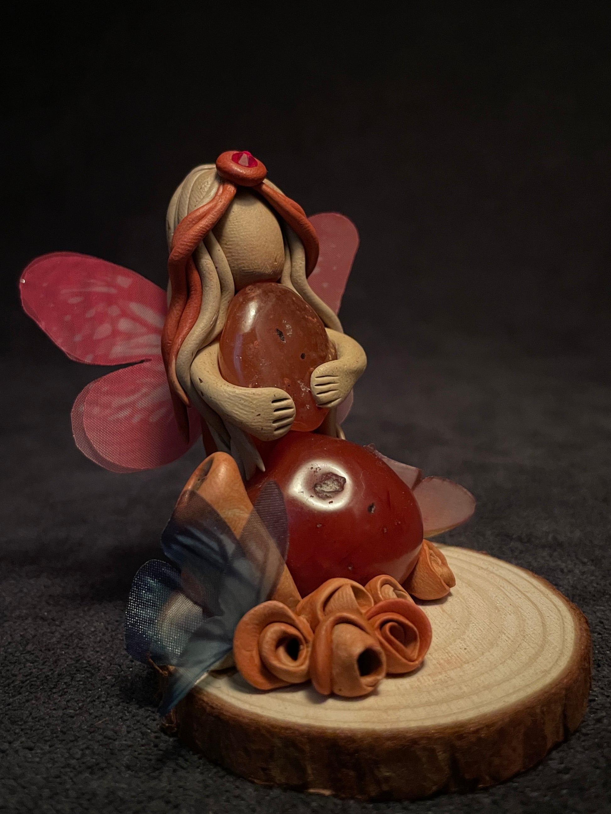 Cette figurine se compose de deux pierres naturelles de cornaline. Ses ailes sont en tissu et son socle est en bois. C'est aussi un porte-encens.