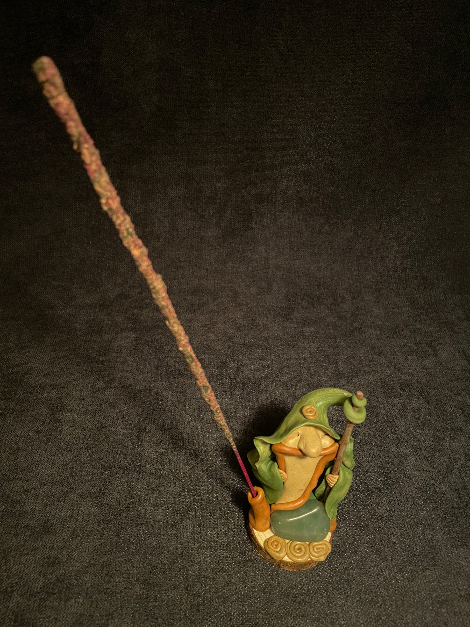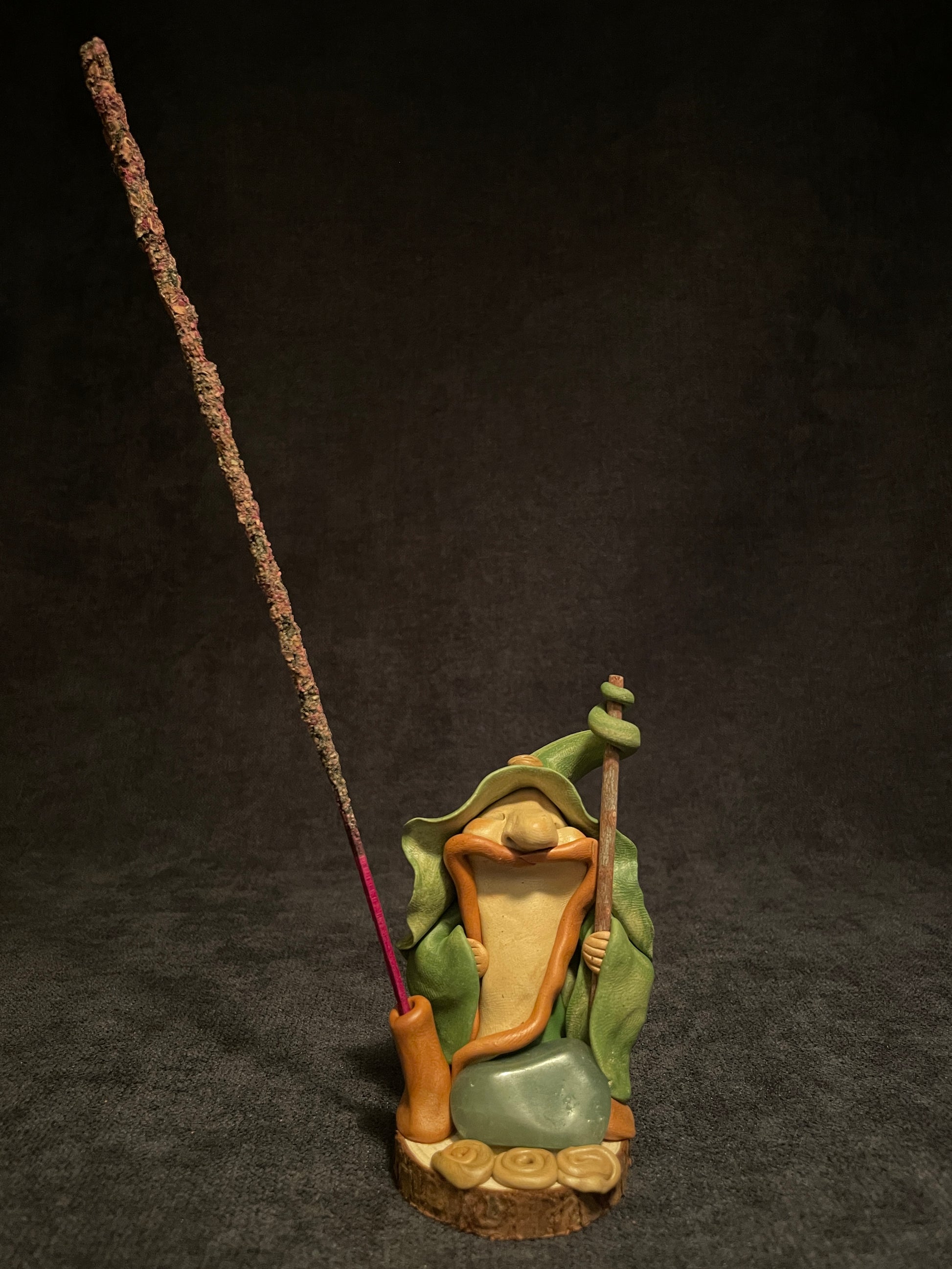 Cette figurine se compose d'une pierre naturelle et d'autres accessoires en éléments naturels. Son socle est en bois. C'est aussi un porte-encens.