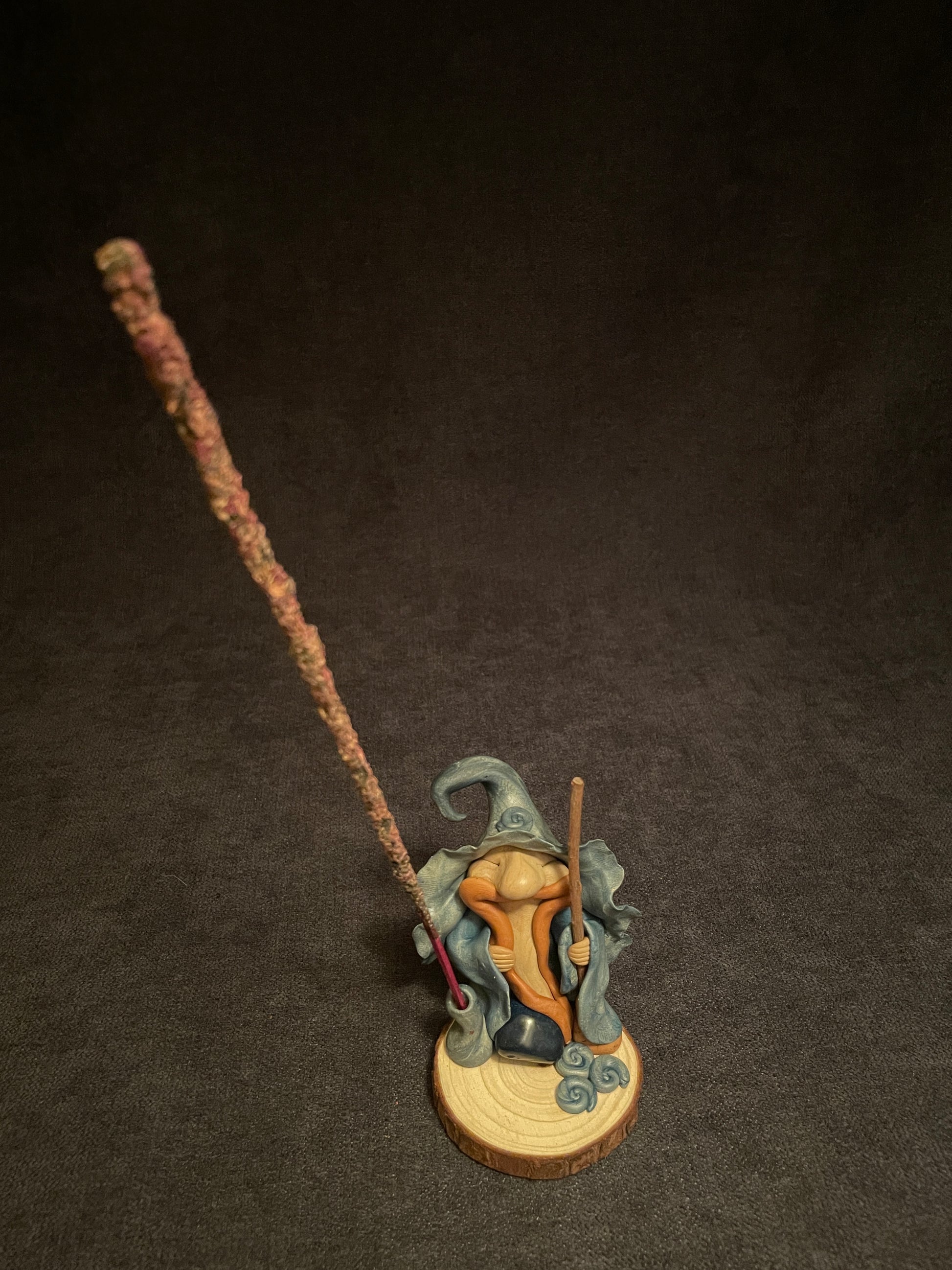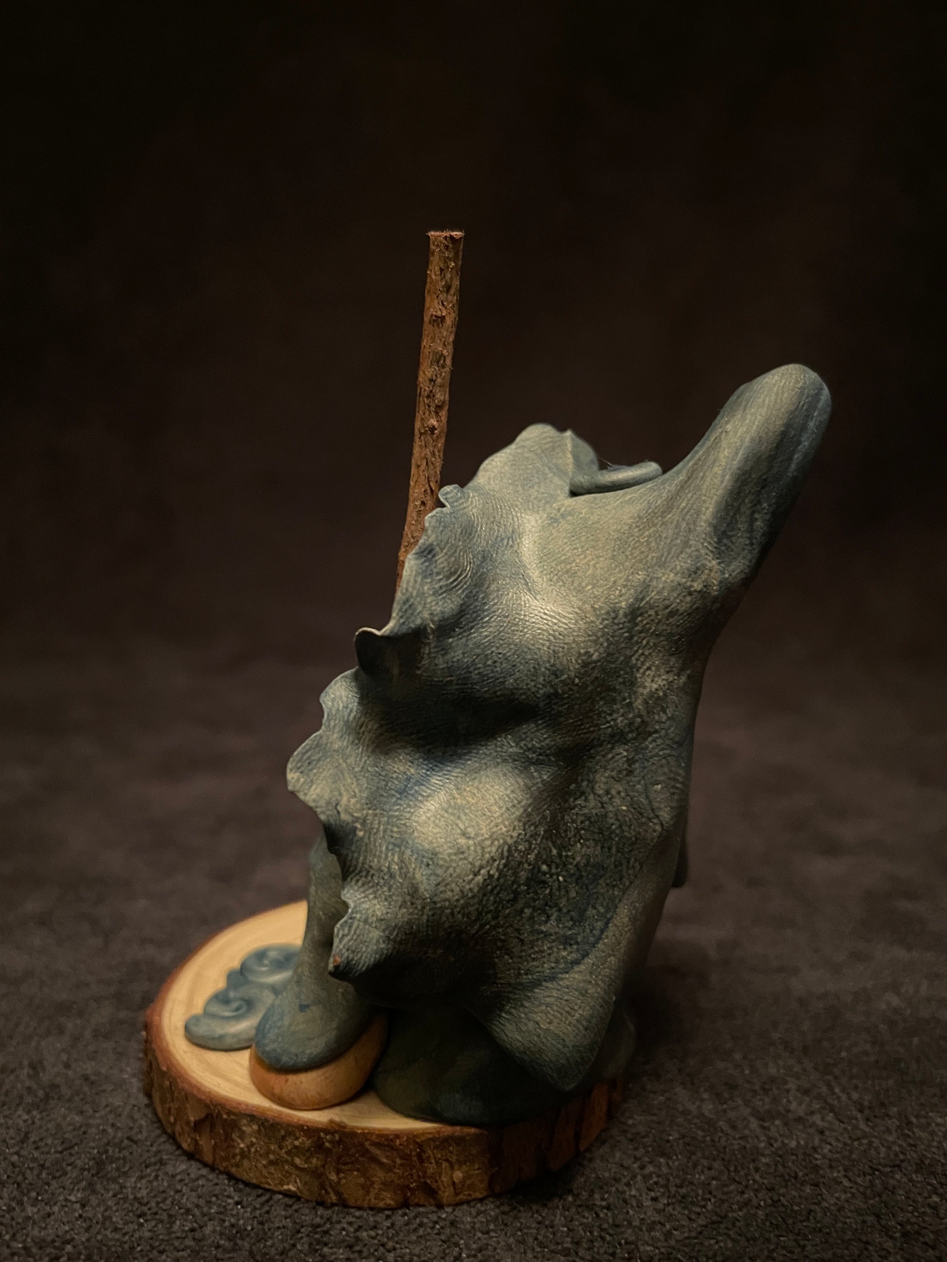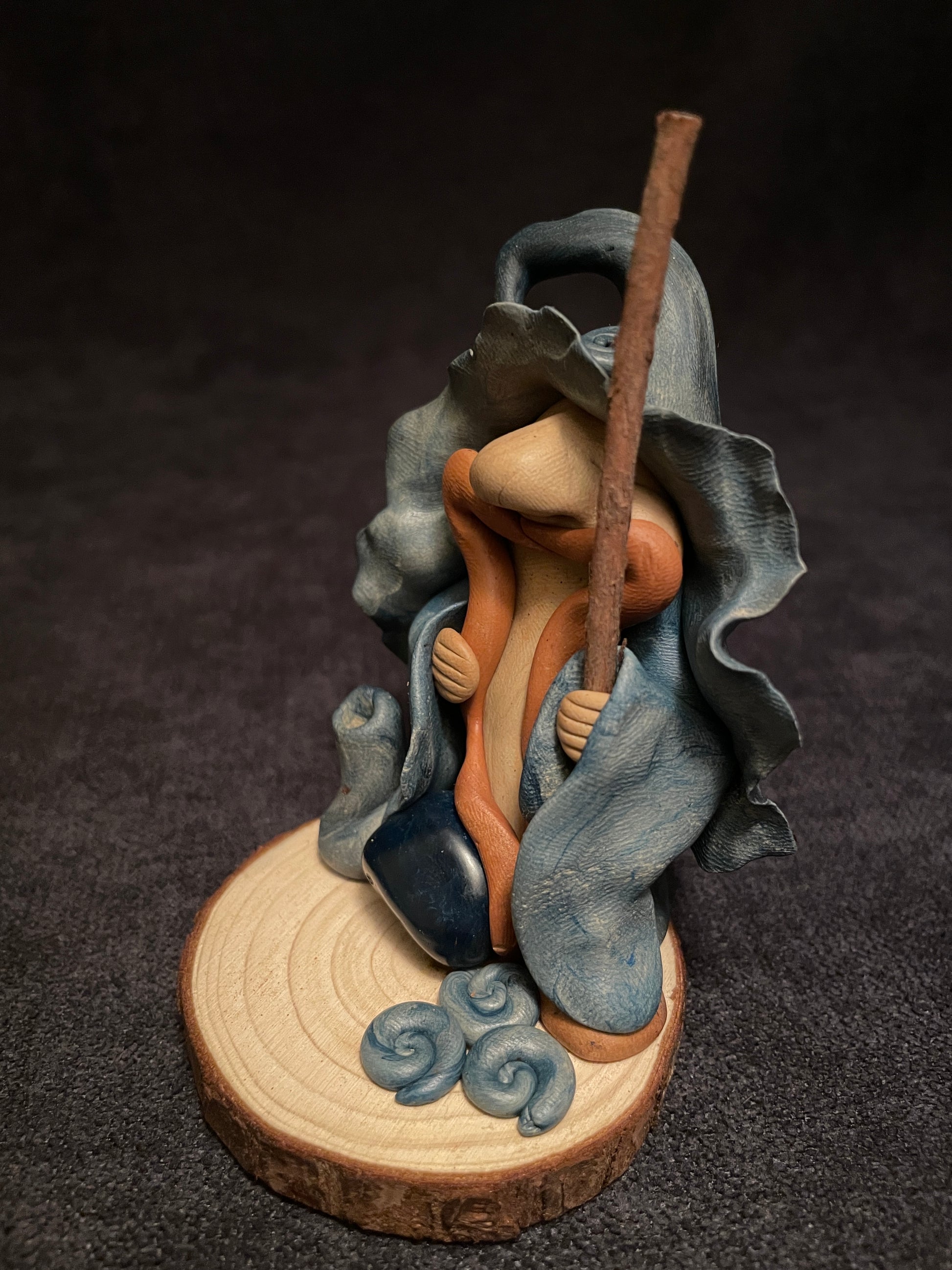 Cette figurine se compose d'une pierre naturelle et d'autres accessoires en éléments naturels. Son socle est en bois. C'est aussi un porte-encens.