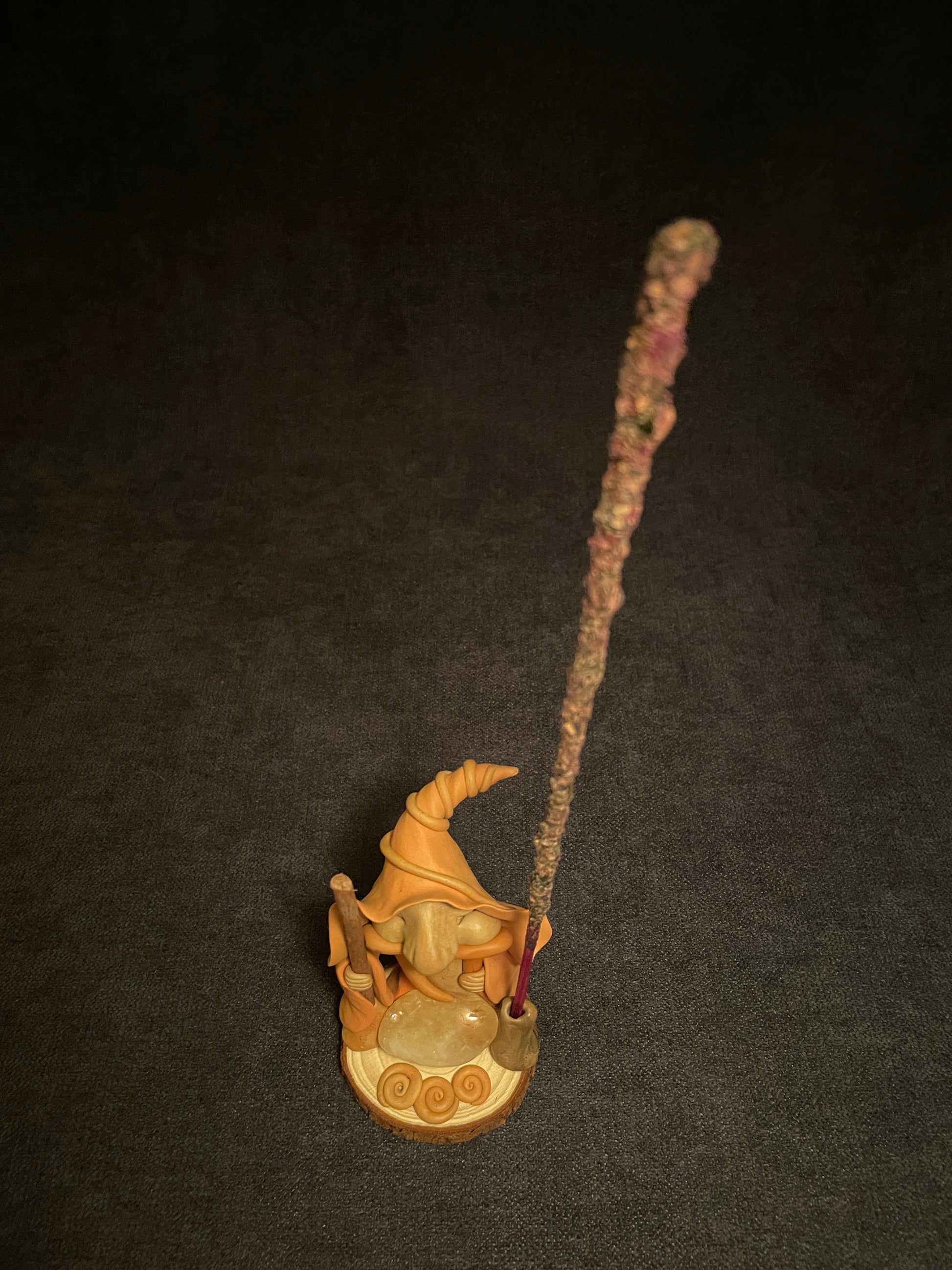 Cette figurine se compose d'une pierre naturelle et d'autres accessoires en éléments naturels. Son socle est en bois. C'est aussi un porte-encens.