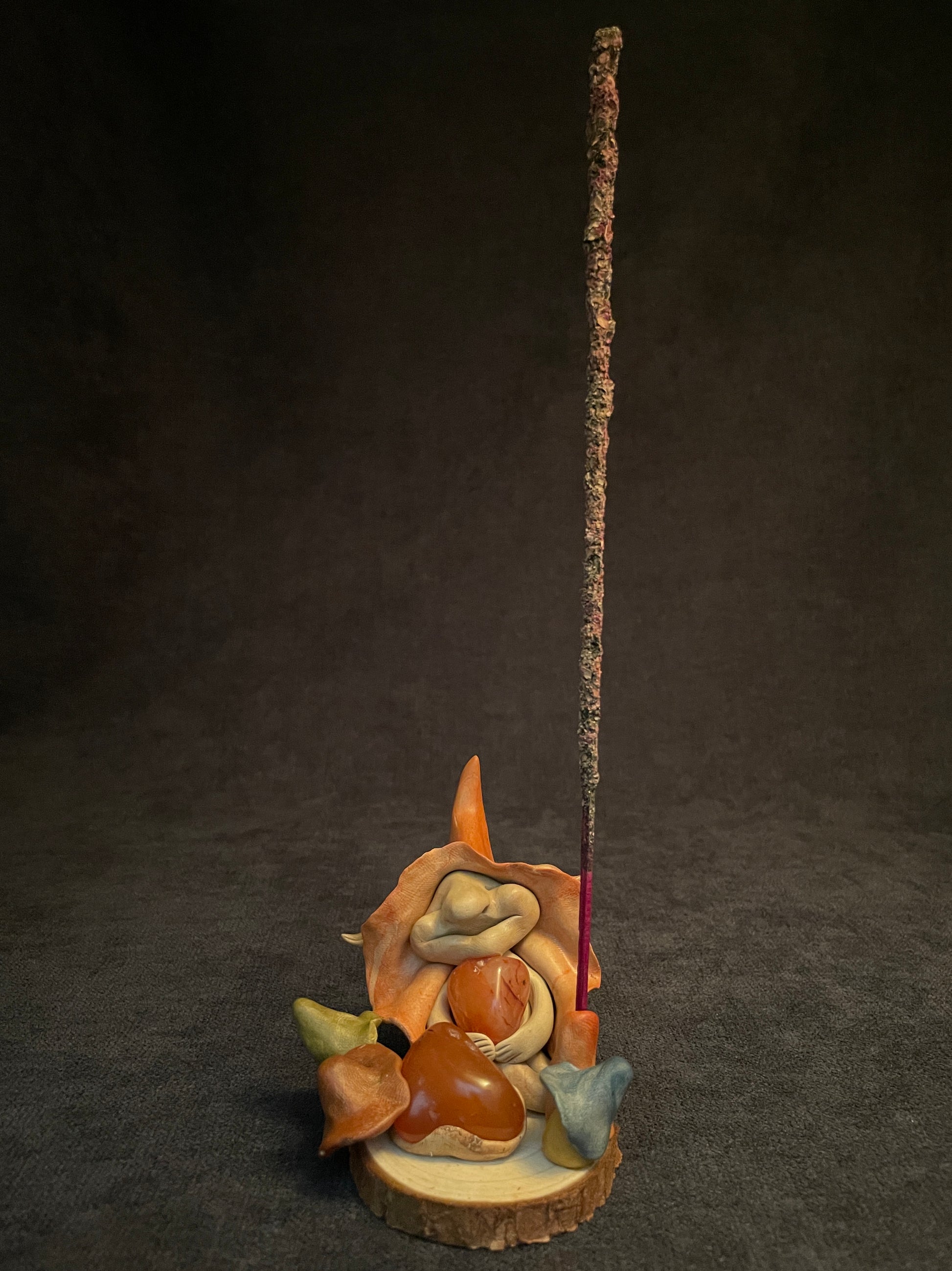Cette figurine se compose de deux pierres naturelles de cornaline. Les champignons sont modelés. Son socle est en bois et c'est aussi un porte-encens.