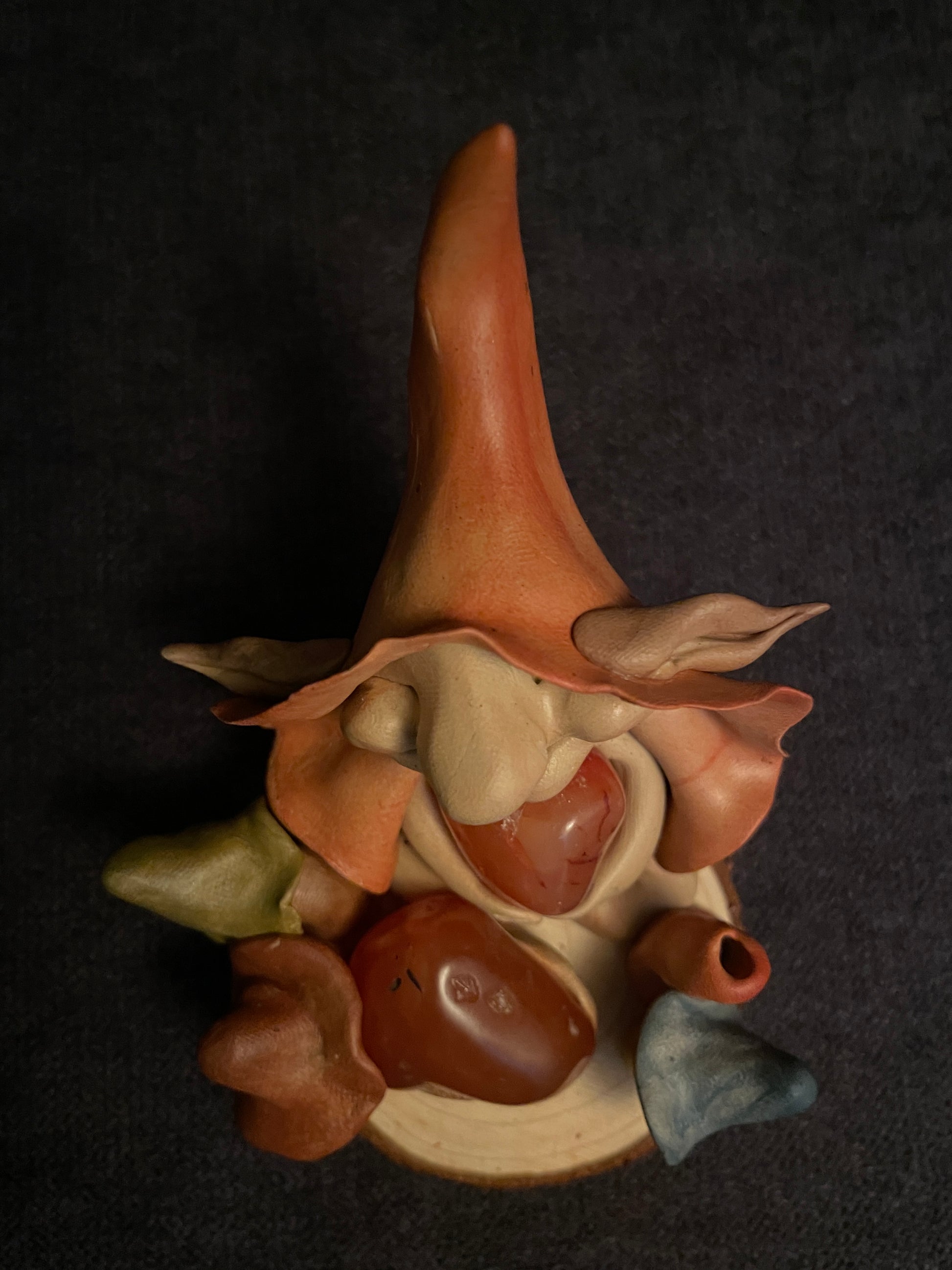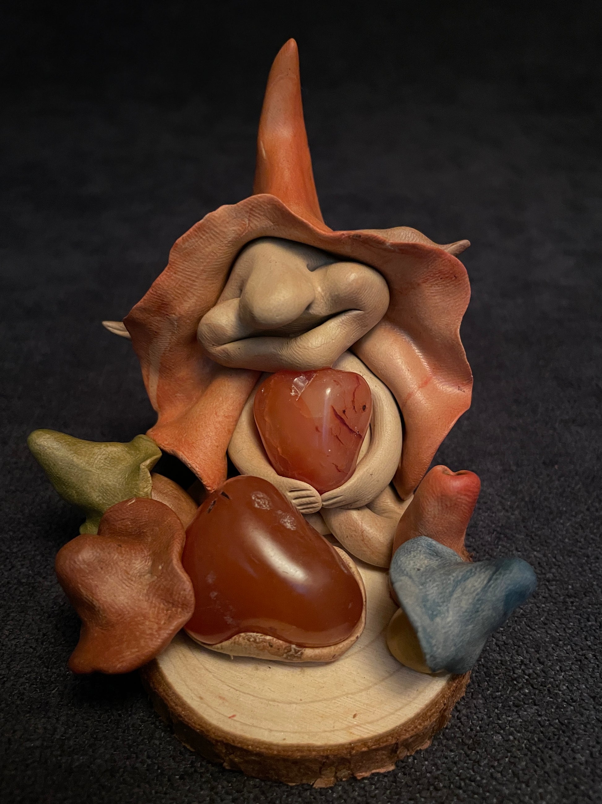 Je modèle ces lutins en pâte autodurcissante. Chaque figurine est une pièce unique qui se distingue selon son caractère, ses éléments naturels et sa singularité.