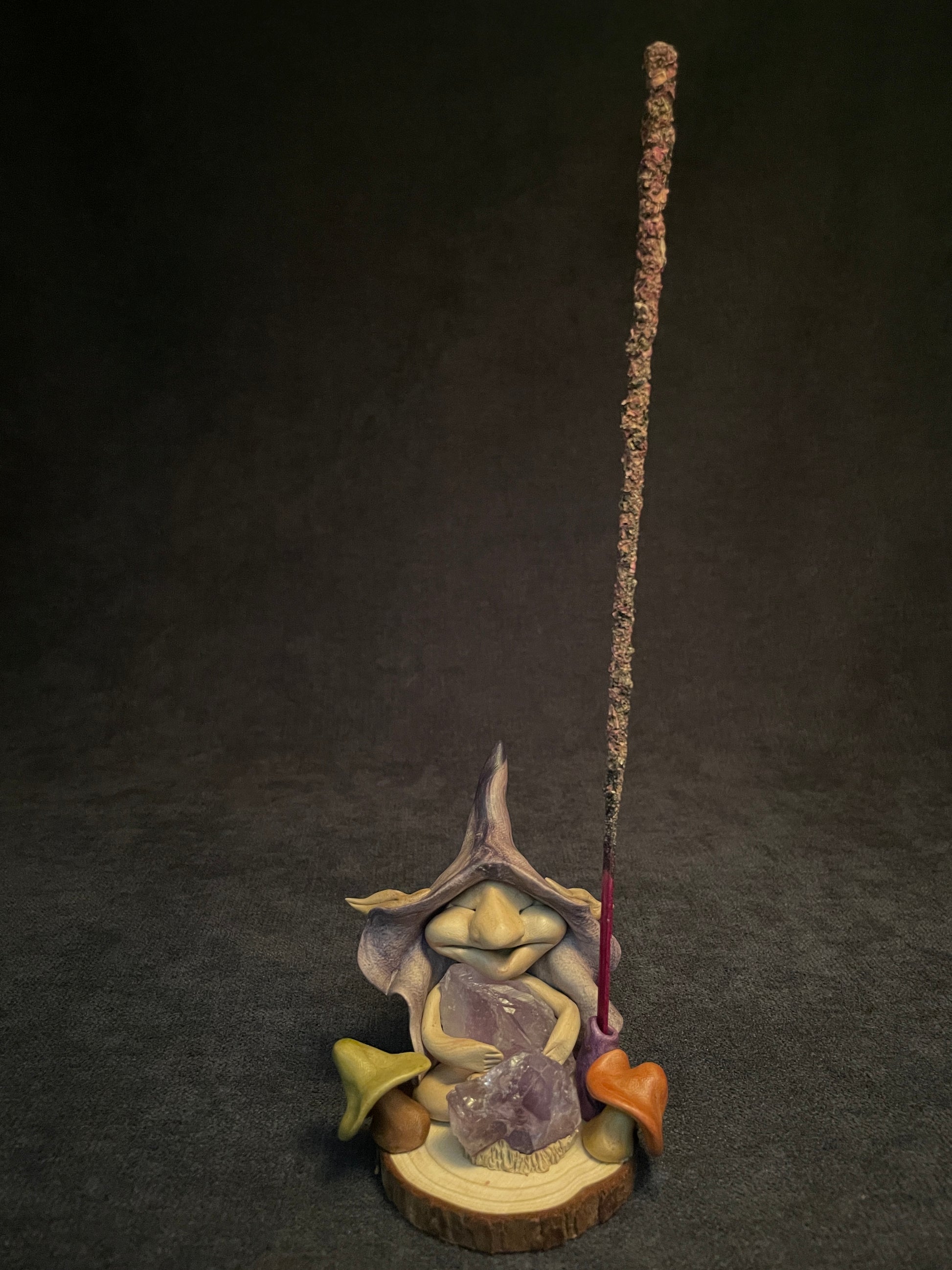 Cette figurine se compose de deux pierres naturelles d'améthyste. Les champignons sont modelés. Son socle est en bois et c'est aussi un porte-encens.