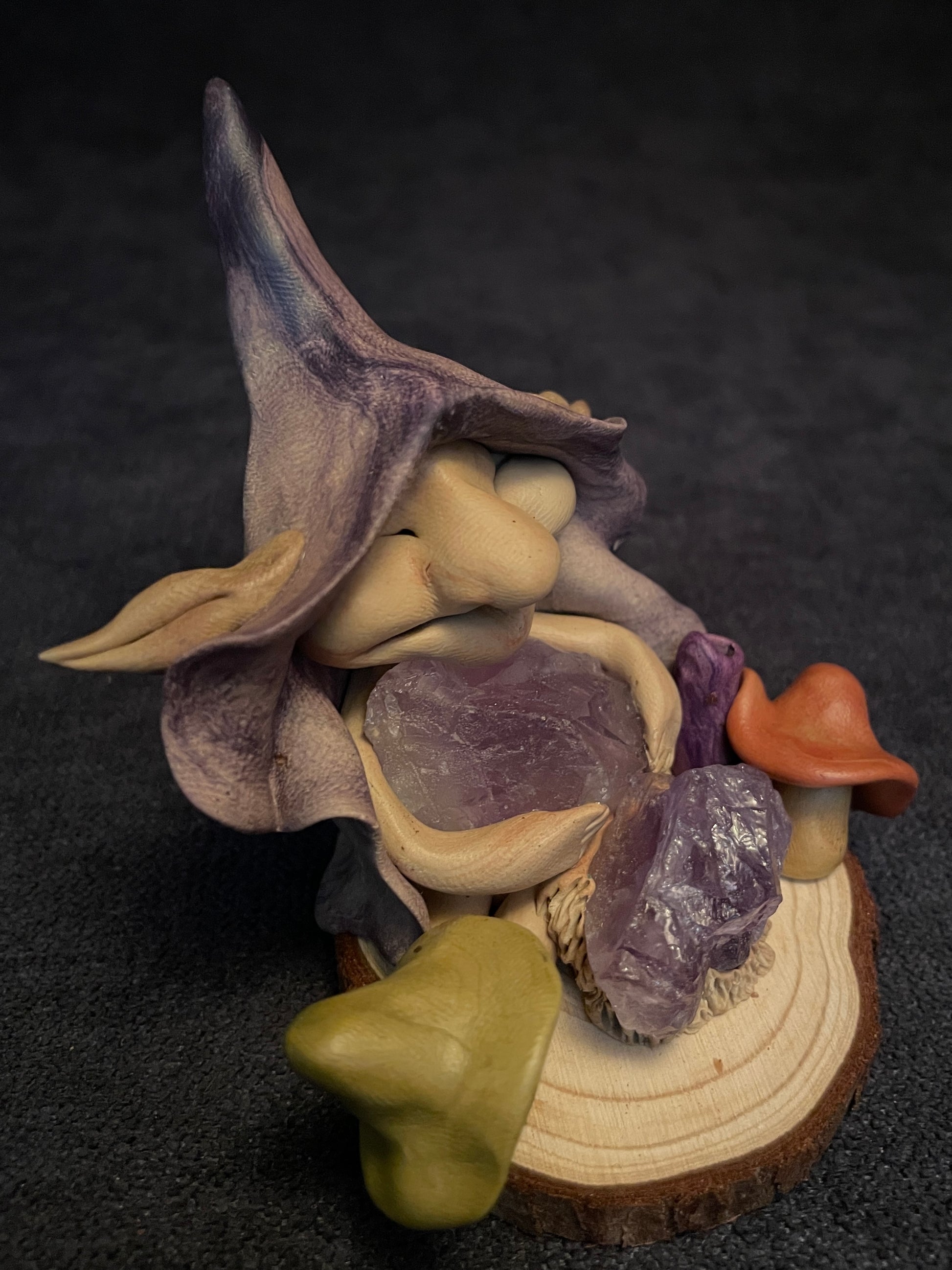 Je modèle ces lutins en pâte autodurcissante. Chaque figurine est une pièce unique qui se distingue selon son caractère, ses éléments naturels et sa singularité.