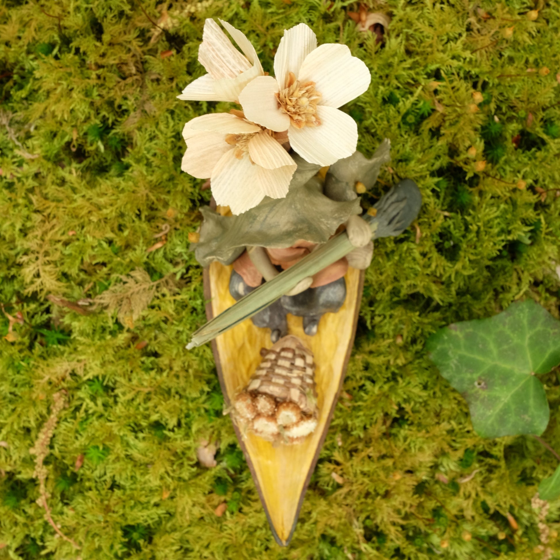 Diese Figur besteht aus einer gelben Schale aus Canoinha-Samen, einer Manacá-Wurzel und Maisstrohblüten. Trockenblumen sind naturbelassen. Es ist auch ein Räucherstäbchenhalter.