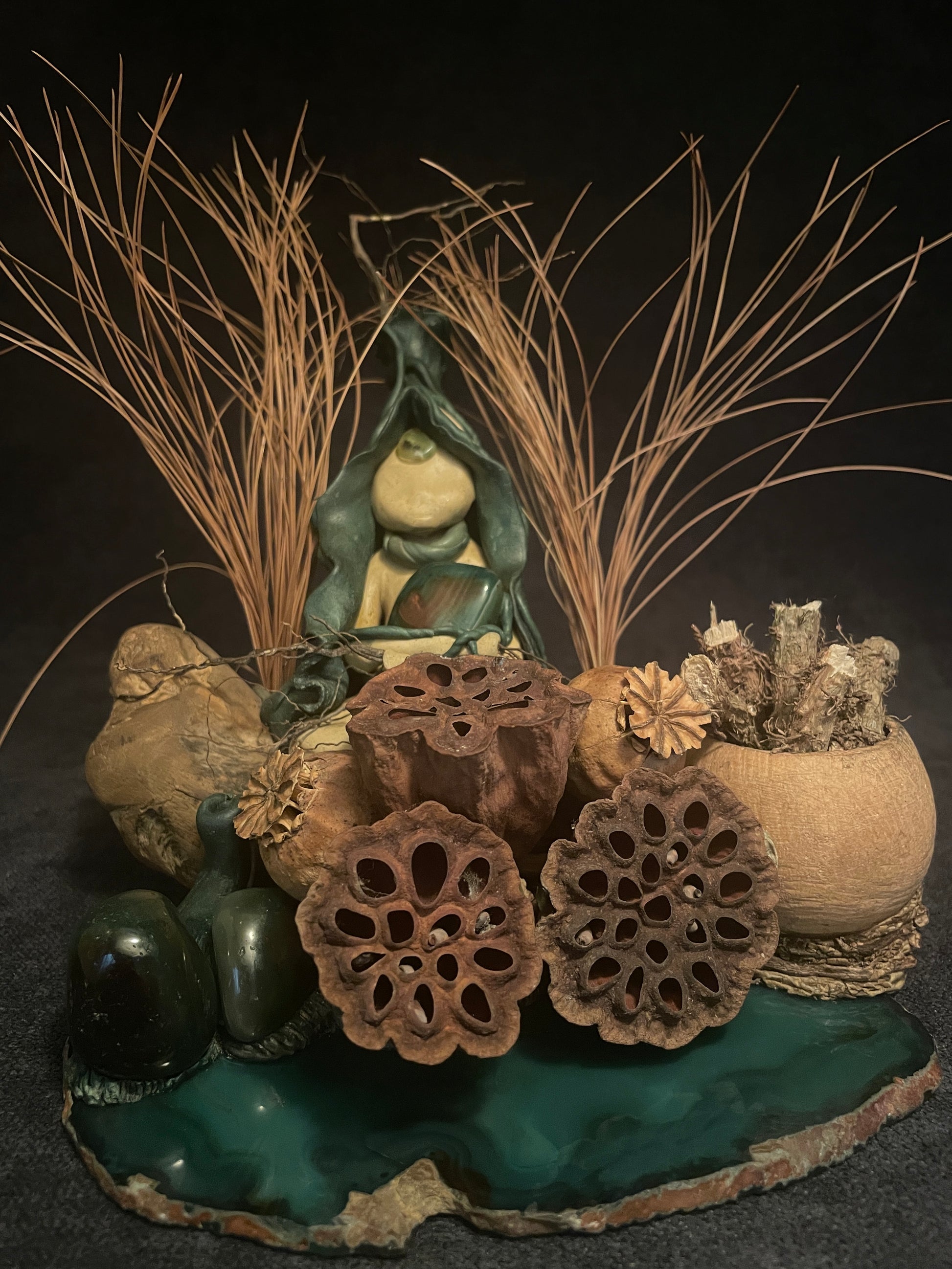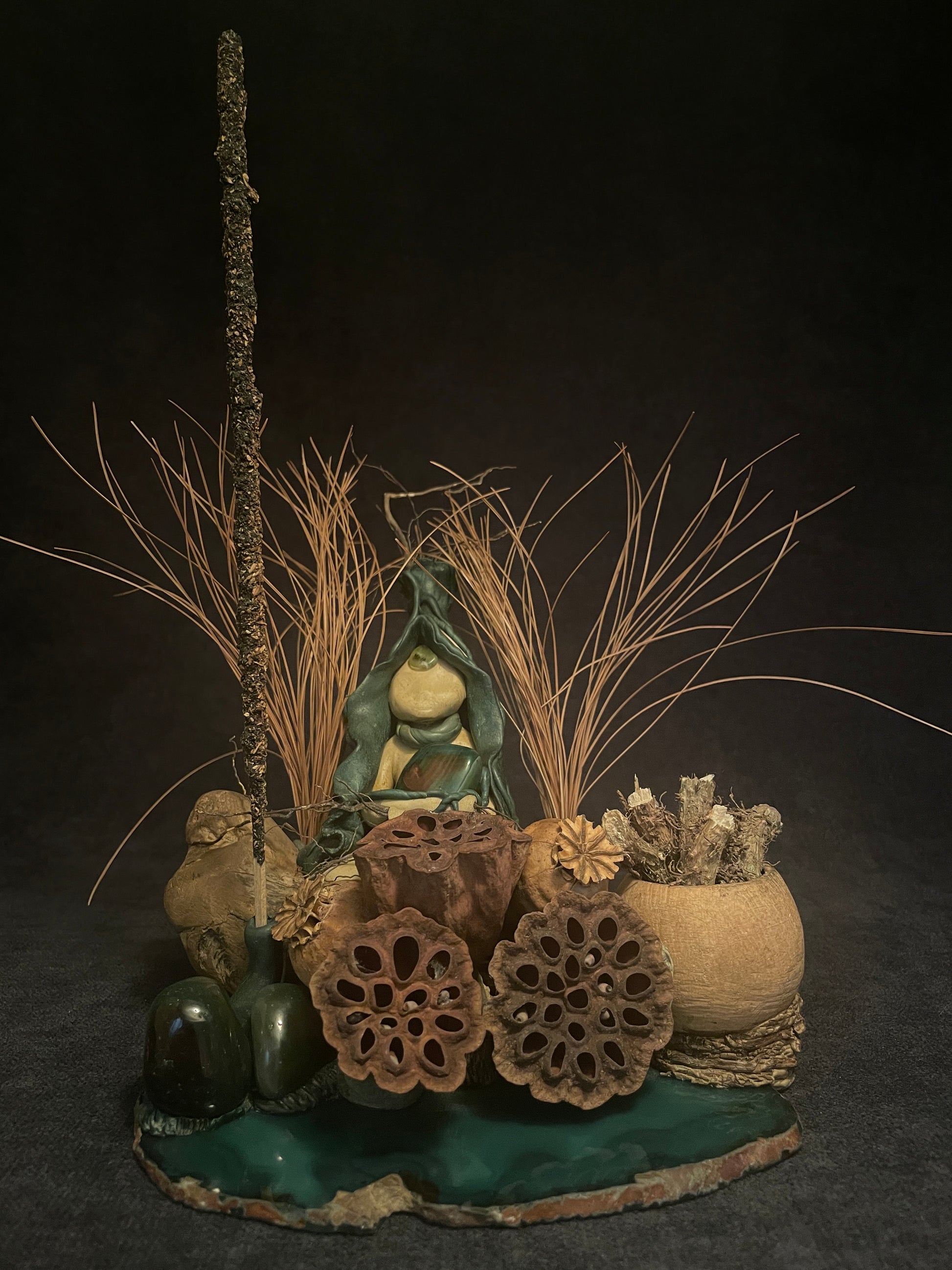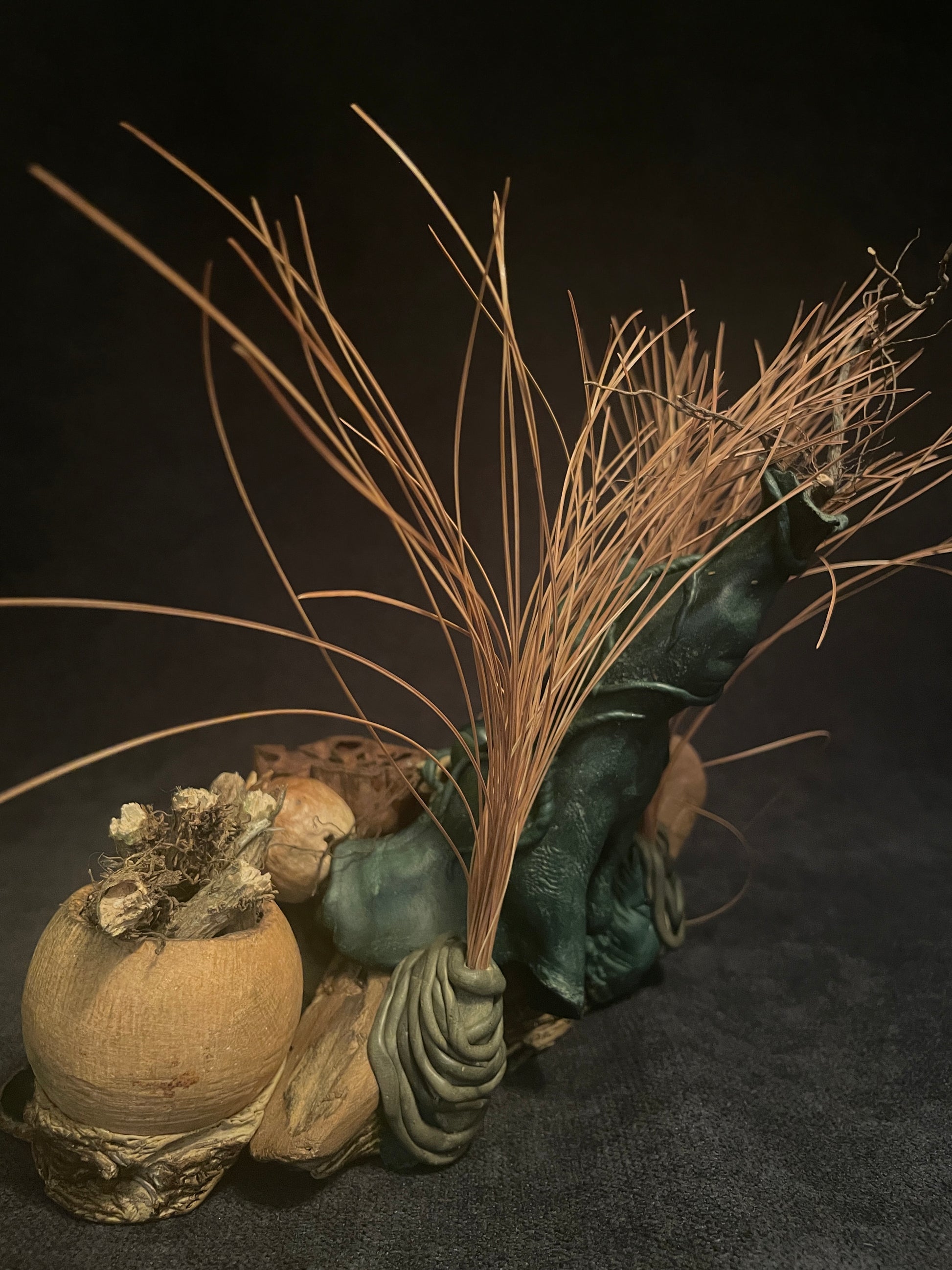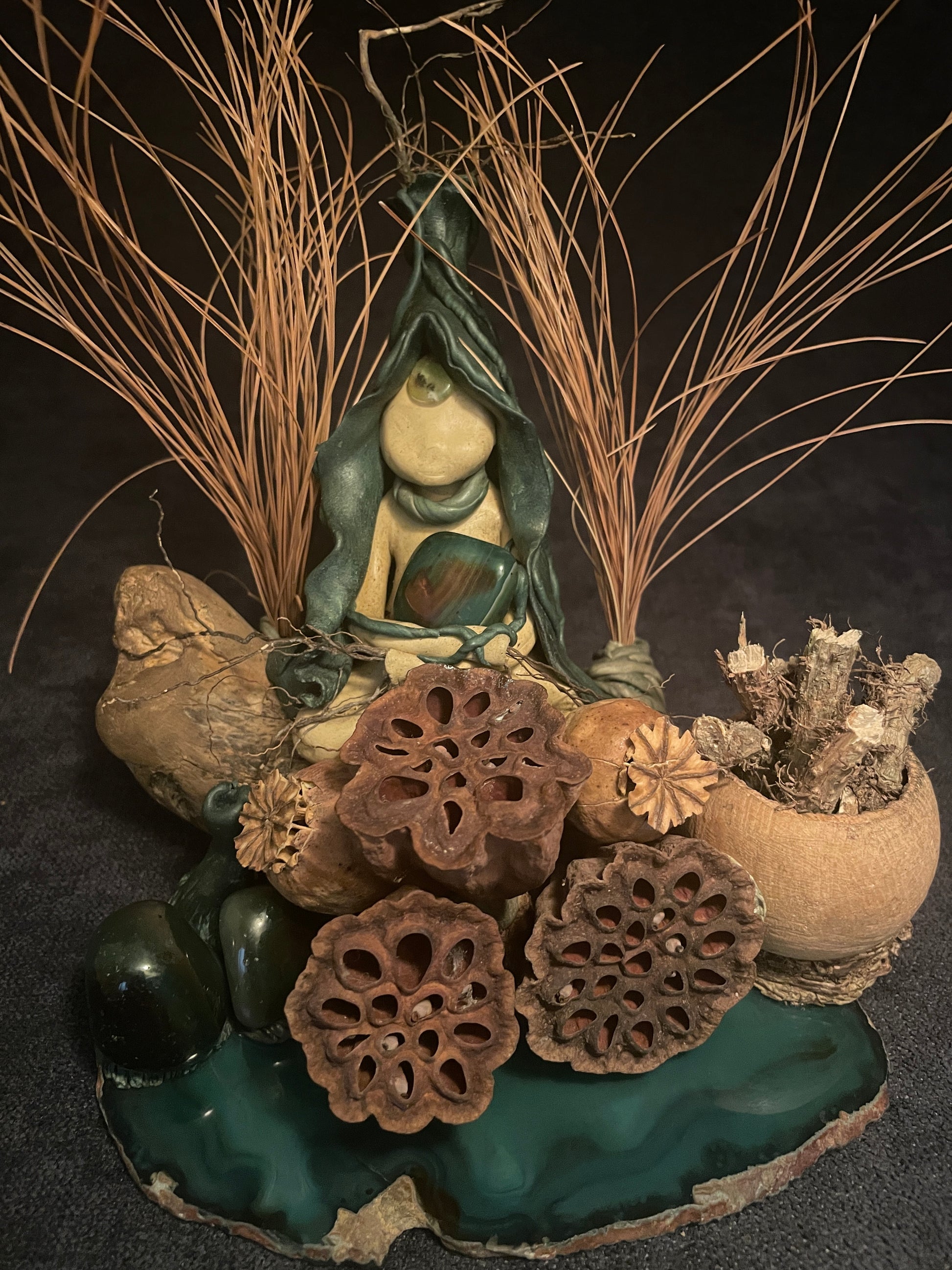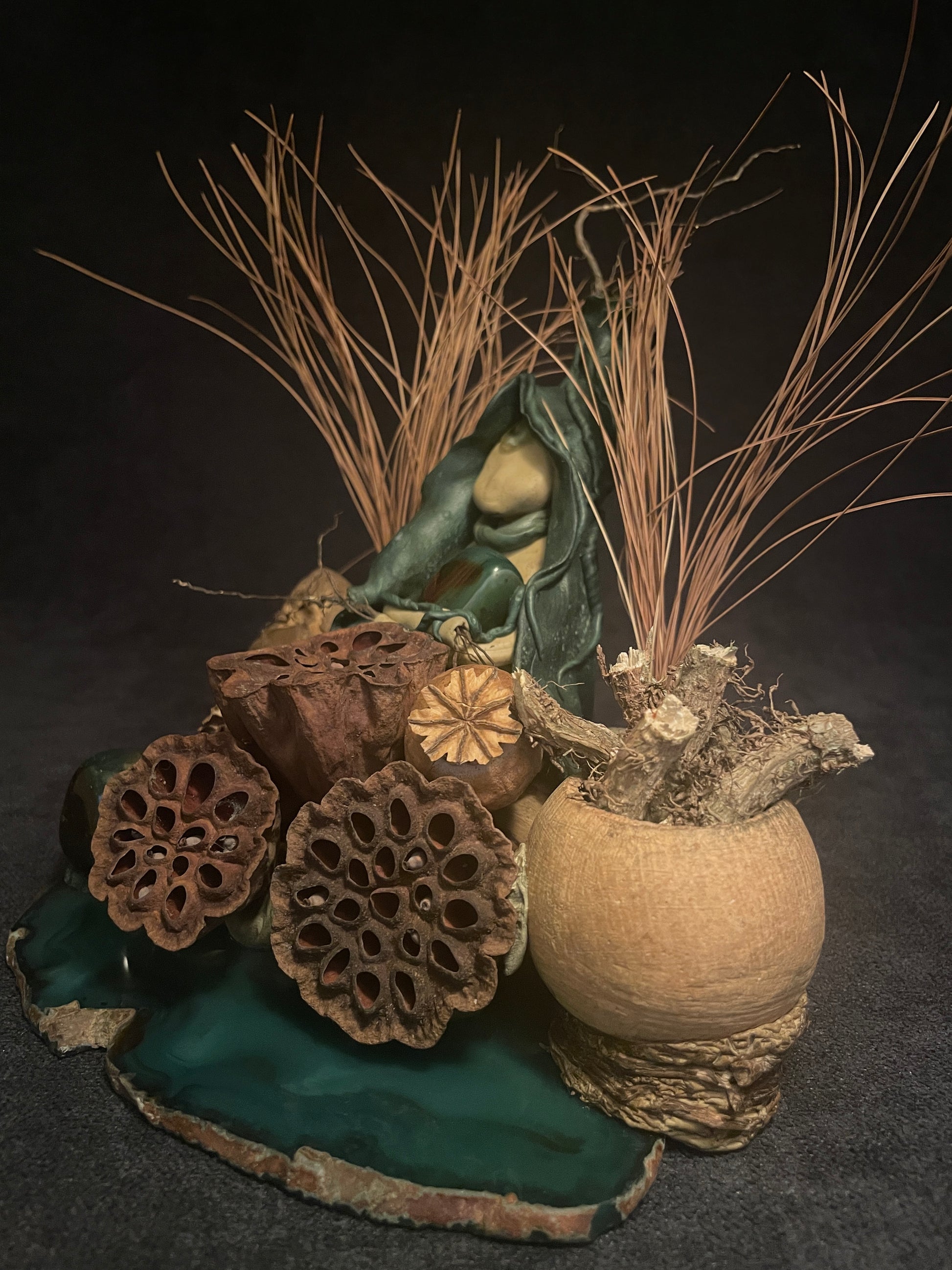Diese Figur besteht aus drei natürlichen Labradoritsteinen. Ihre Krone besteht aus Federreiher und Fischschuppen. Ihre Halskette ist eine Muschel. Seine Flügel bestehen aus Fischschuppen. Sein Sockel besteht aus natürlichem Achatstein. Eine Reiherfeder schmückt das Stück. An der Seite befindet sich ein Räucherstäbchenhalter.