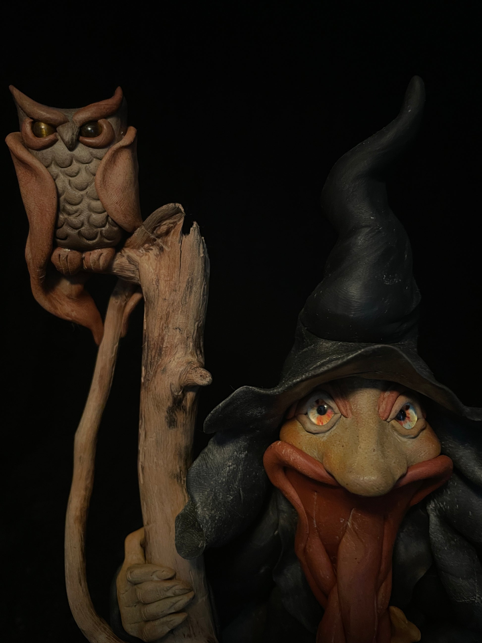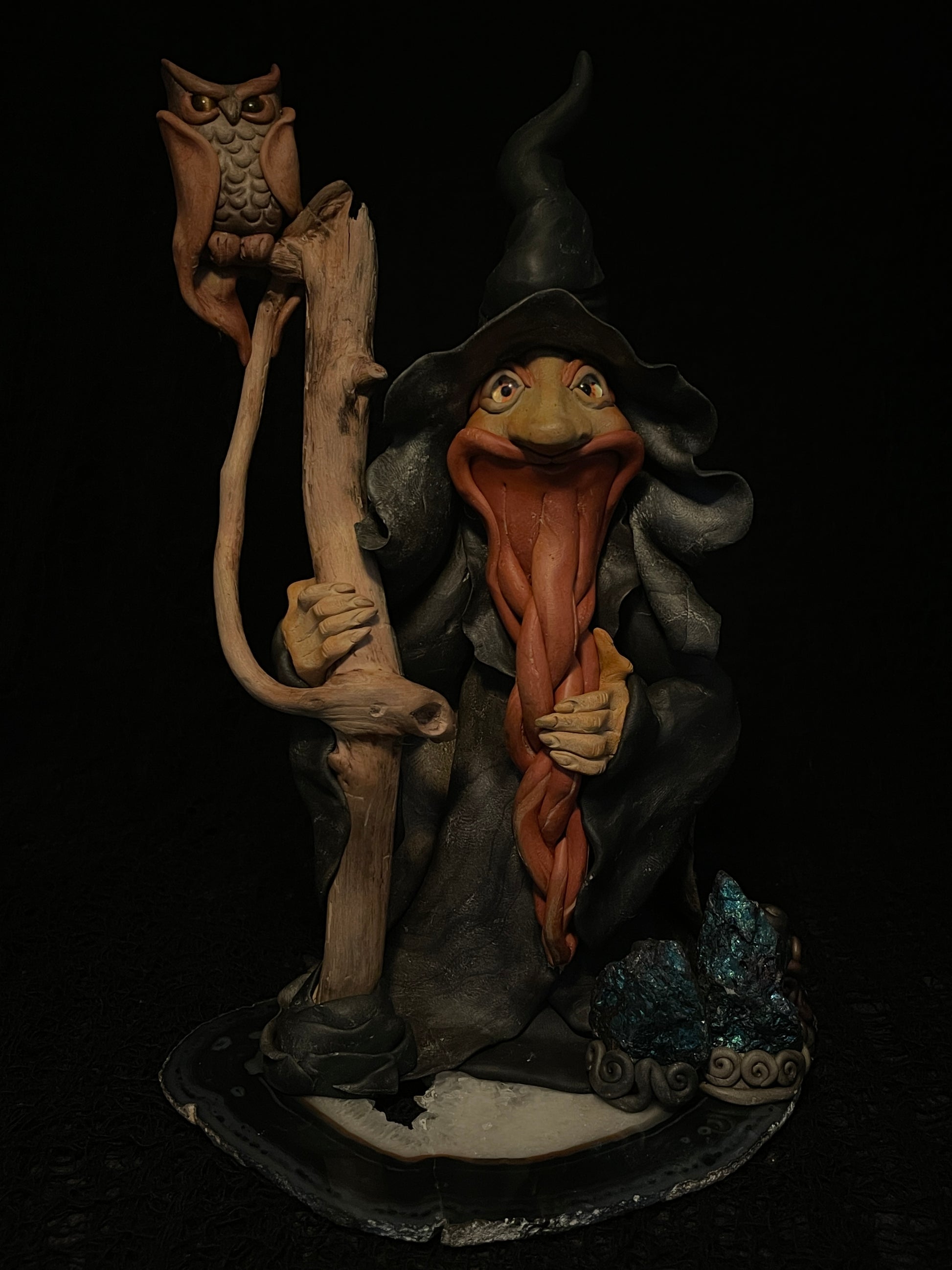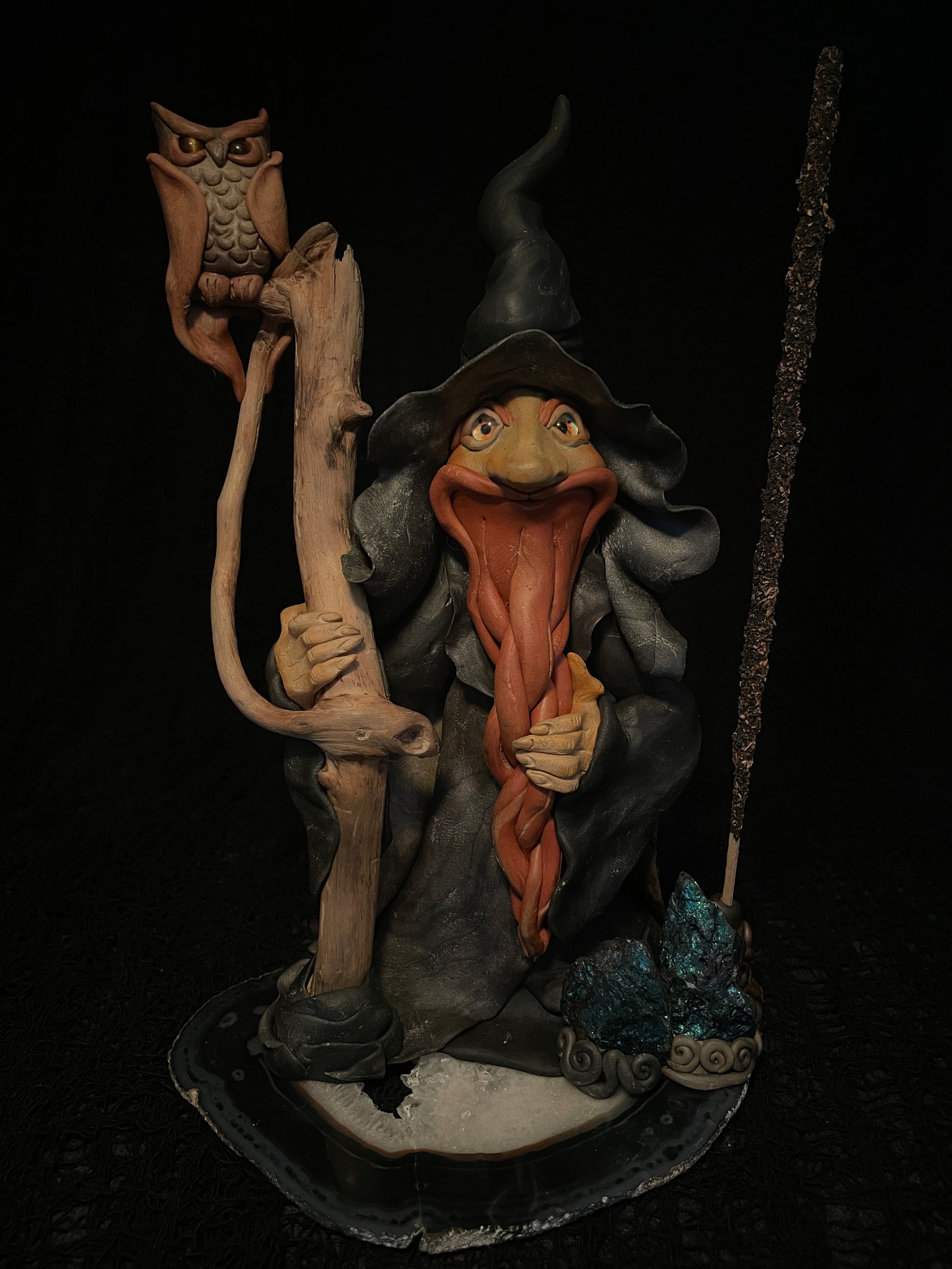 J'ai modelé ce druide en pâte autodurcissante. Chaque figurine est une pièce unique qui se distingue de par son caractère, ses éléments naturels et sa singularité.