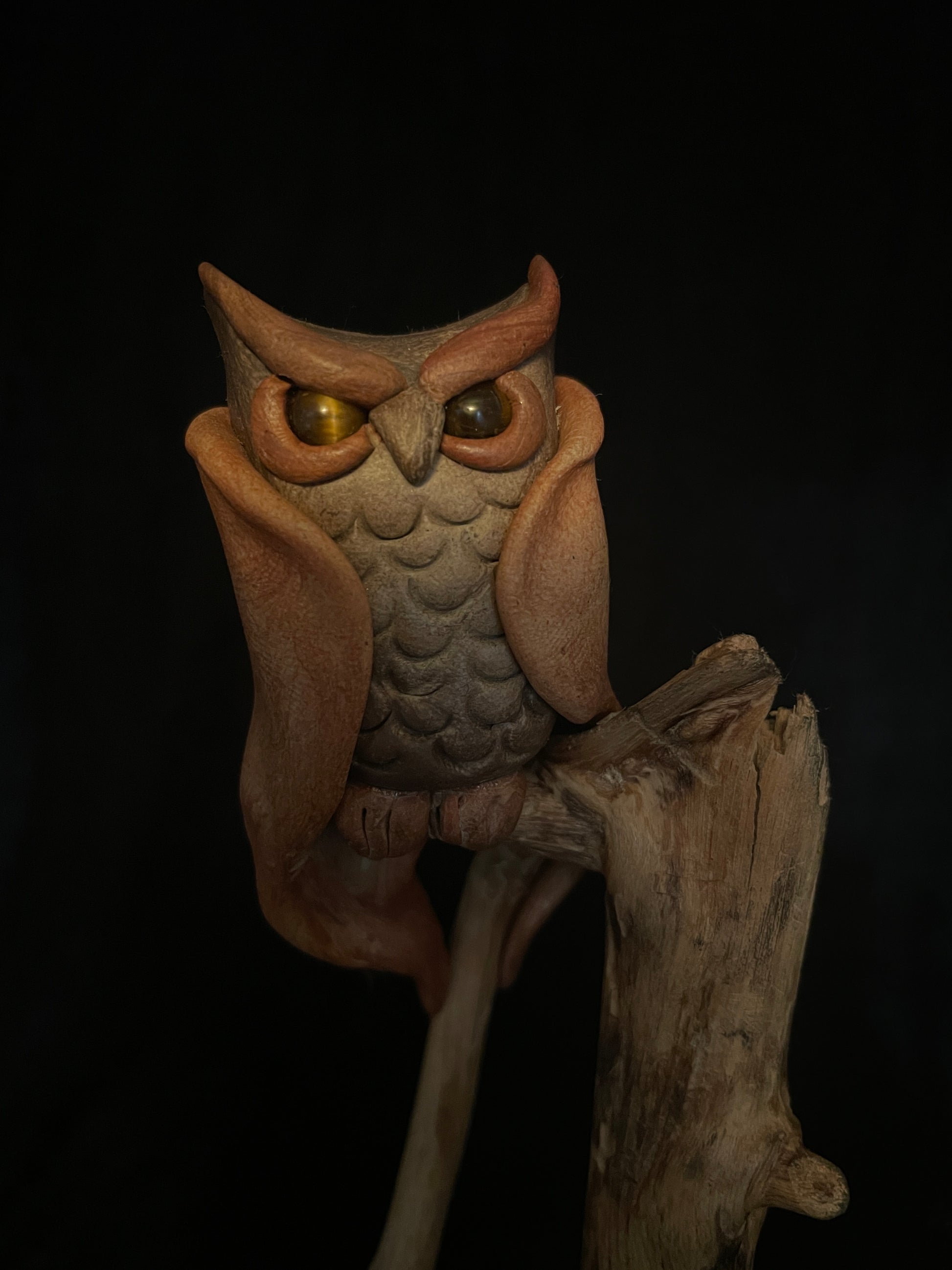 Cette figurine se compose de deux pierres naturelles de chalcopyrite. Le bâton tenu par le druide est en bois flotté naturel. Les yeux de la chouette sont des pierres naturelles d'oeil de tigre. le socle est en pierre naturelle d'agate. C'est aussi un porte encens.