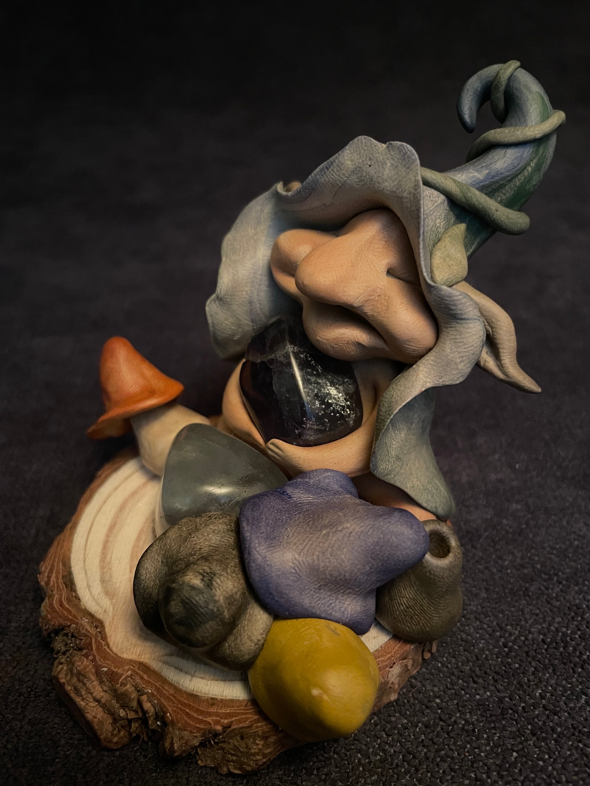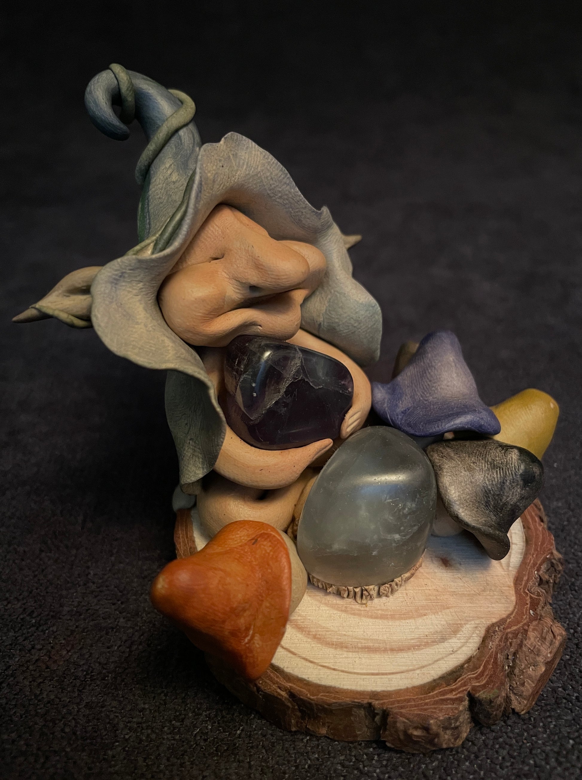 Je modèle ces lutins en pâte autodurcissante. Chaque figurine est une pièce unique qui se distingue selon son caractère, ses éléments naturels et sa singularité.