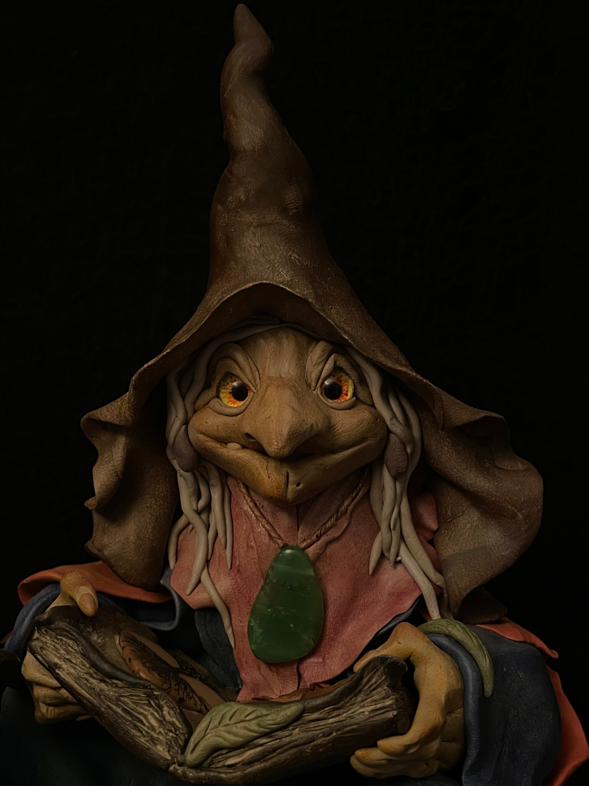 J'ai modelé cette sorcière en pâte autodurcissante. Chaque figurine est une pièce unique qui se distingue de par son caractère, ses éléments naturels et sa singularité.