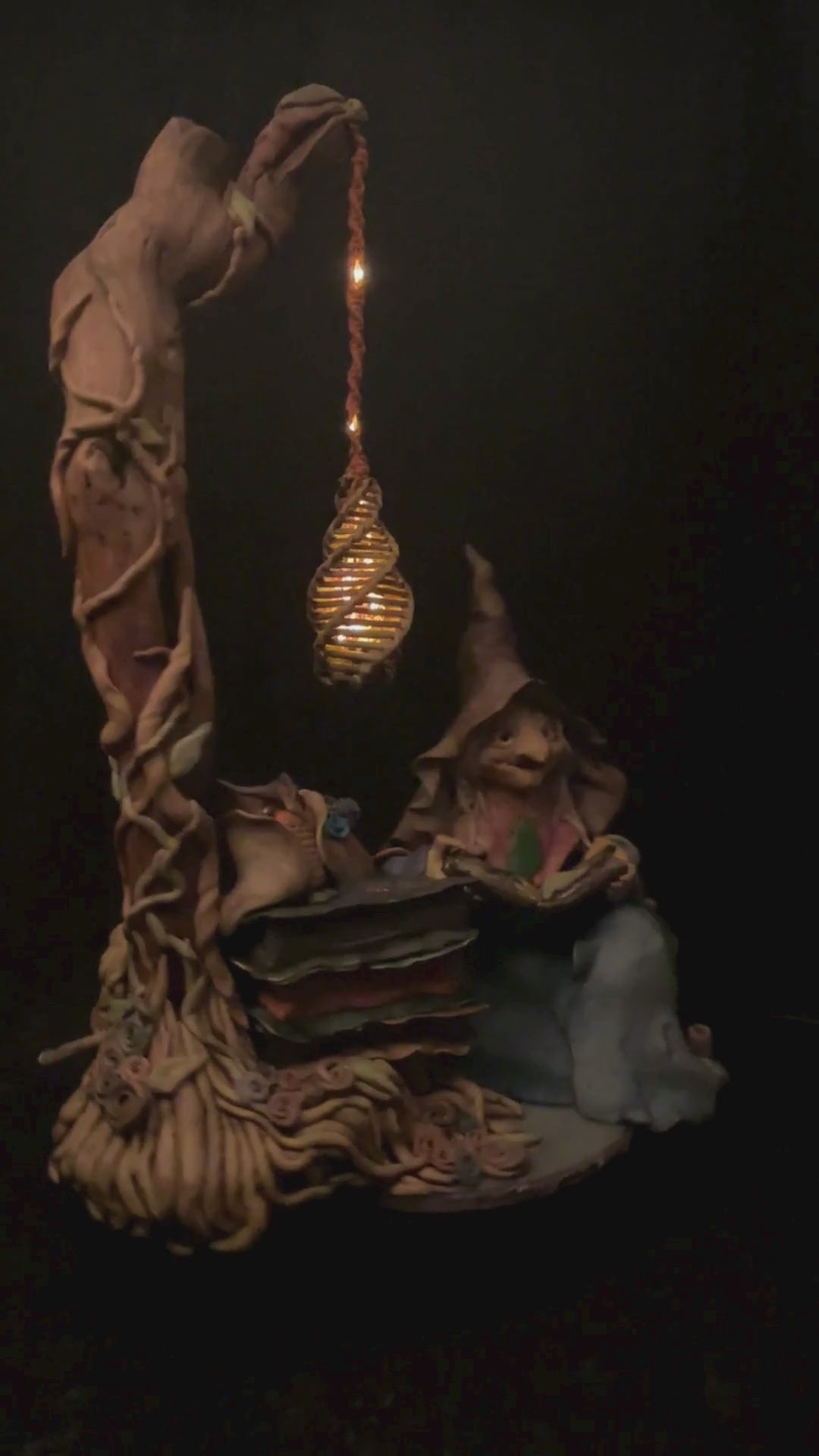 Cette figurine se compose d'un ensemble modelé posé sur une pierre naturelle d'agate grise. Une pierre naturelle de jade australien forme le collier de la sorcière. Le tronc d'arbre est en bois naturel où est accroché un luminaire en fibres naturelles. Une chouette est posée sur les grimoires à côté du personnage. Un compartiment pour 2 piles LR6 AA 1,5Volts est placé sur la partie arrière de la figurine (piles non fournies). Des détails en cuivre ornent la pièce. C'est aussi un porte encens.