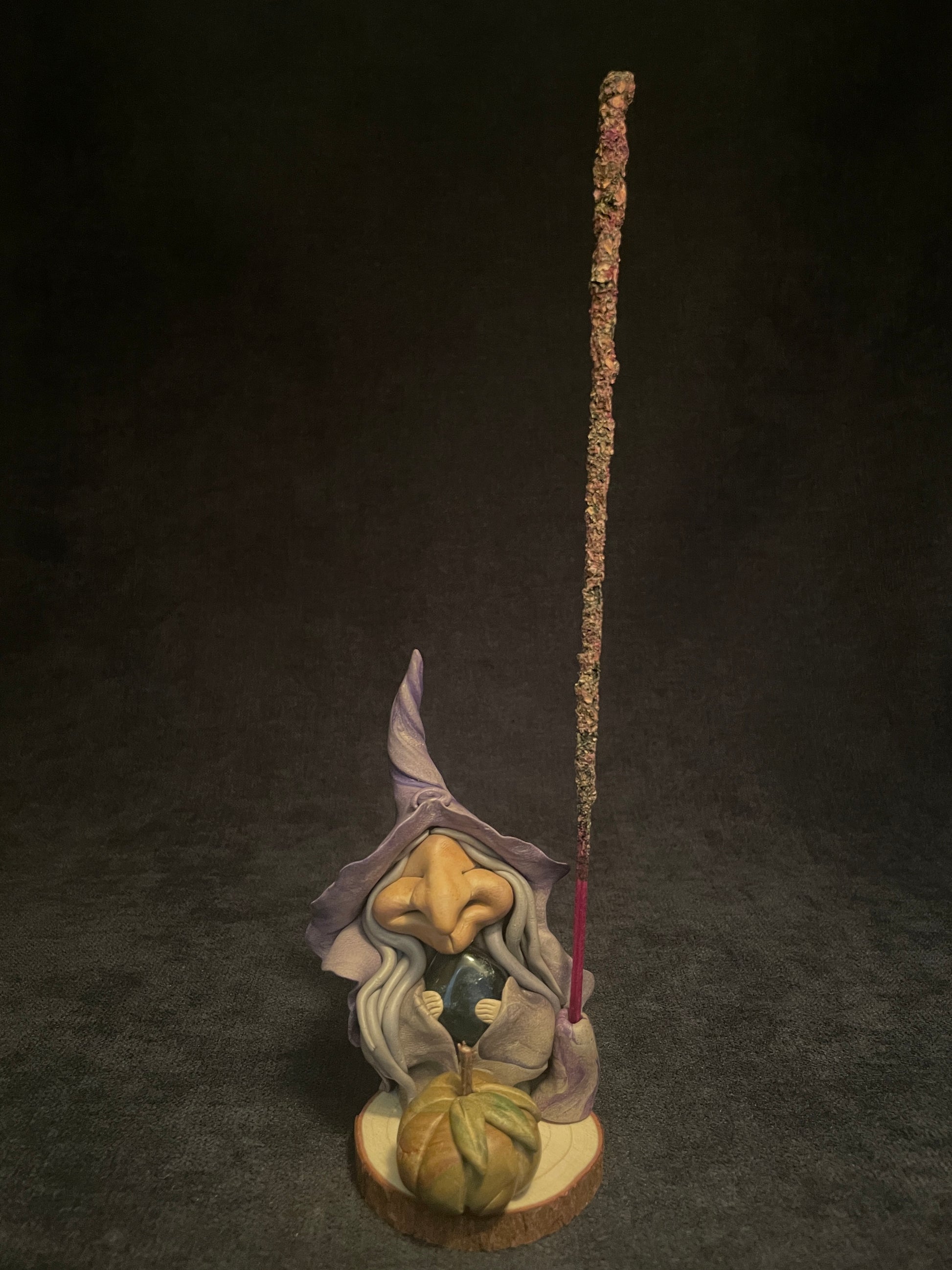 Cette figurine se compose d'une pierre naturelle et d'autres accessoires en éléments naturels. Son socle est en bois. C'est aussi un porte-encens.